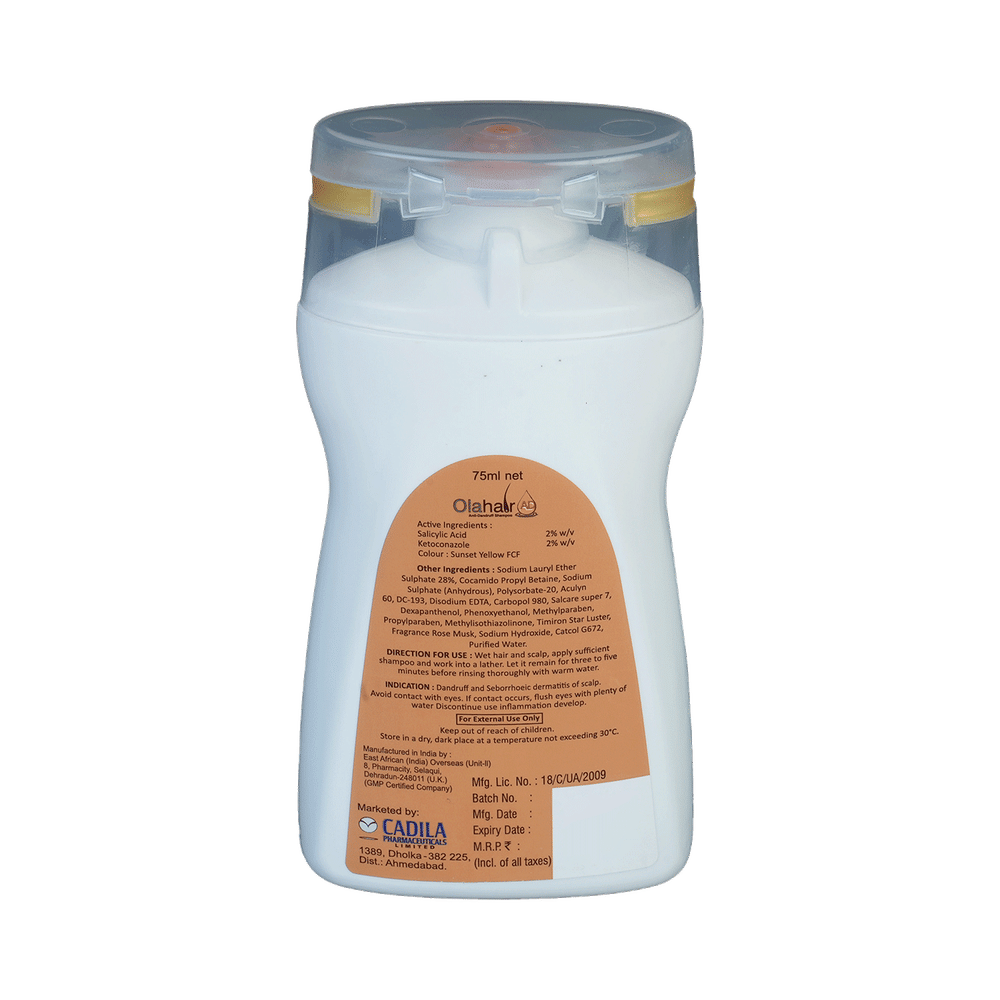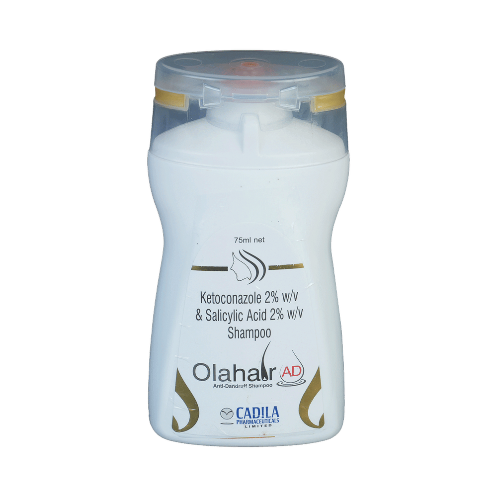 Olahair AD Shampoo is a combination of two medicines: Ketoconazole and Salicylic Acid which treat dandruff. Ketoconazole is an antifungal. It works by stopping the growth of dandruff-causing fungi by preventing them from forming their own protective covering. Salicylic Acid is a keratolytic medicine which helps break down the skin clumps on scalp and relieves itching and flaking associated with dandruff.