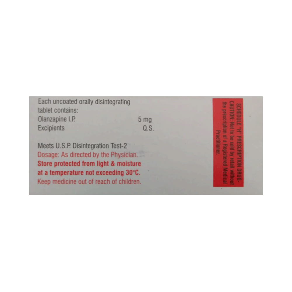 Olahil 5 Tablet DT is used in the treatment of schizophrenia (a mental disorder that can result in hallucinations or delusions and also adversely affects a person’s ability to think and behave) and mania. Olahil 5 Tablet DT may be taken with or without food. However, it is advised to take it at the same time each day as this helps to maintain a consistent level of medicine in the body. Take this medicine in the dose and duration as advised by your doctor and if you have missed a dose, take it as soon as you remember. This medication mustn't be stopped suddenly without talking to your doctor as it may worsen your symptoms.Some common side effects of this medicine include dryness in the mouth, constipation, muscle rigidity, and restlessness. Initially, this medicine may cause a sudden drop in blood pressure when you change positions, so it is better to rise slowly if you have been sitting or lying down. It also causes dizziness and sleepiness, so do not drive or do anything that requires mental focus until you know how this medicine affects you.However, this medicine may increase your weight, blood sugar, and cholesterol levels but, modifying your lifestyle by having a healthy diet and exercising regularly can reduce this side effect. You should be cautious as in rare cases it may cause serious side effects like very high blood sugar levels or seizures.