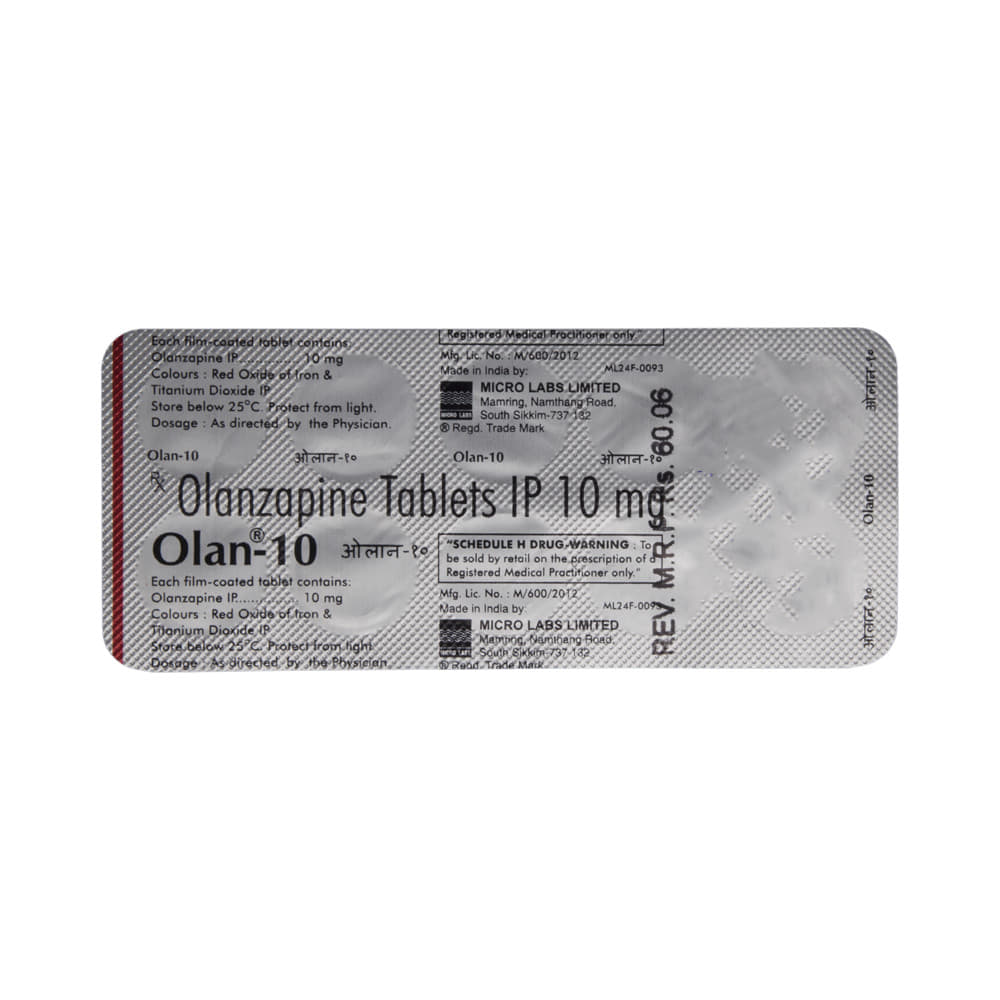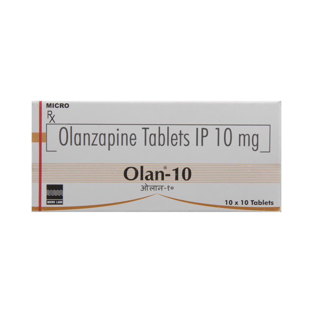 OlAN 10 Tablet is used in the treatment of schizophrenia (a mental disorder that can result in hallucinations or delusions and also adversely affects a person’s ability to think and behave) and mania. OlAN 10 Tablet may be taken with or without food. However, it is advised to take it at the same time each day as this helps to maintain a consistent level of medicine in the body. Take this medicine in the dose and duration as advised by your doctor and if you have missed a dose, take it as soon as you remember. This medication mustn't be stopped suddenly without talking to your doctor as it may worsen your symptoms.Some common side effects of this medicine include dryness in the mouth, constipation, muscle rigidity, and restlessness. Initially, this medicine may cause a sudden drop in blood pressure when you change positions, so it is better to rise slowly if you have been sitting or lying down. It also causes dizziness and sleepiness, so do not drive or do anything that requires mental focus until you know how this medicine affects you.However, this medicine may increase your weight, blood sugar, and cholesterol levels but, modifying your lifestyle by having a healthy diet and exercising regularly can reduce this side effect. You should be cautious as in rare cases it may cause serious side effects like very high blood sugar levels or seizures.