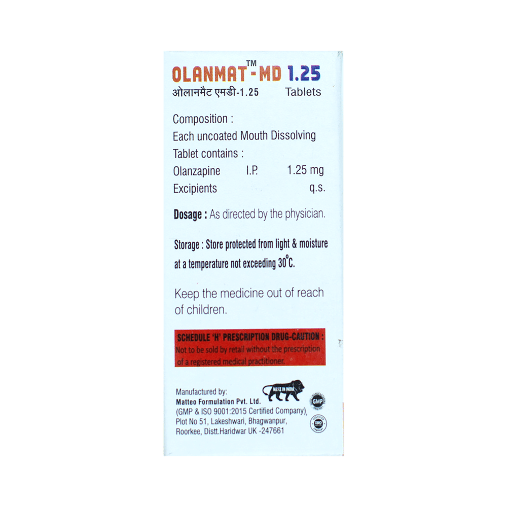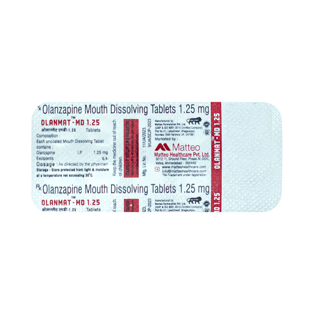 Olanmat-MD 1.25 Tablet is used in the treatment of schizophrenia (a mental disorder that can result in hallucinations or delusions and also adversely affects a person’s ability to think and behave) and mania. Olanmat-MD 1.25 Tablet may be taken with or without food. However, it is advised to take it at the same time each day as this helps to maintain a consistent level of medicine in the body. Take this medicine in the dose and duration as advised by your doctor and if you have missed a dose, take it as soon as you remember. This medication mustn't be stopped suddenly without talking to your doctor as it may worsen your symptoms.Some common side effects of this medicine include dryness in the mouth, constipation, muscle rigidity, and restlessness. Initially, this medicine may cause a sudden drop in blood pressure when you change positions, so it is better to rise slowly if you have been sitting or lying down. It also causes dizziness and sleepiness, so do not drive or do anything that requires mental focus until you know how this medicine affects you.However, this medicine may increase your weight, blood sugar, and cholesterol levels but, modifying your lifestyle by having a healthy diet and exercising regularly can reduce this side effect. You should be cautious as in rare cases it may cause serious side effects like very high blood sugar levels or seizures.