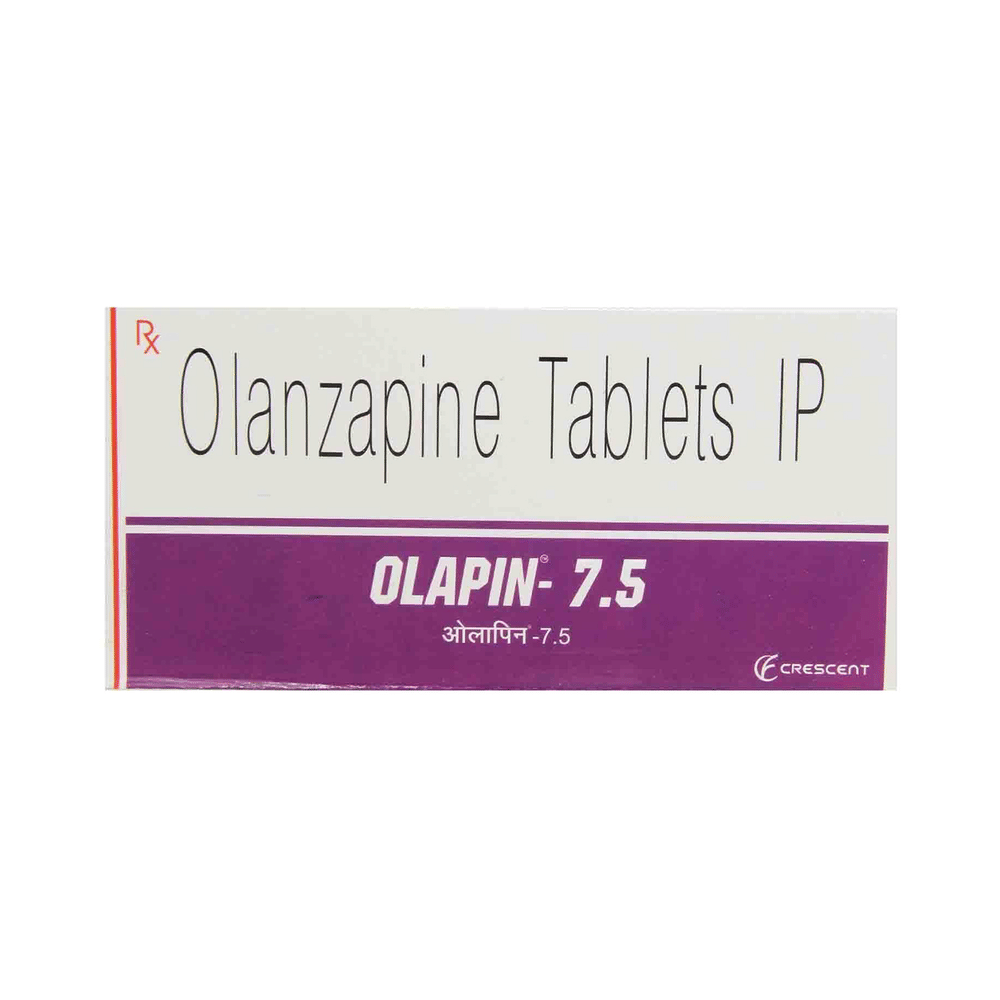 Olapin 7.5 Tablet is used in the treatment of schizophrenia (a mental disorder that can result in hallucinations or delusions and also adversely affects a person’s ability to think and behave) and mania. Olapin 7.5 Tablet may be taken with or without food. However, it is advised to take it at the same time each day as this helps to maintain a consistent level of medicine in the body. Take this medicine in the dose and duration as advised by your doctor and if you have missed a dose, take it as soon as you remember. This medication mustn't be stopped suddenly without talking to your doctor as it may worsen your symptoms.Some common side effects of this medicine include dryness in the mouth, constipation, muscle rigidity, and restlessness. Initially, this medicine may cause a sudden drop in blood pressure when you change positions, so it is better to rise slowly if you have been sitting or lying down. It also causes dizziness and sleepiness, so do not drive or do anything that requires mental focus until you know how this medicine affects you.However, this medicine may increase your weight, blood sugar, and cholesterol levels but, modifying your lifestyle by having a healthy diet and exercising regularly can reduce this side effect. You should be cautious as in rare cases it may cause serious side effects like very high blood sugar levels or seizures.