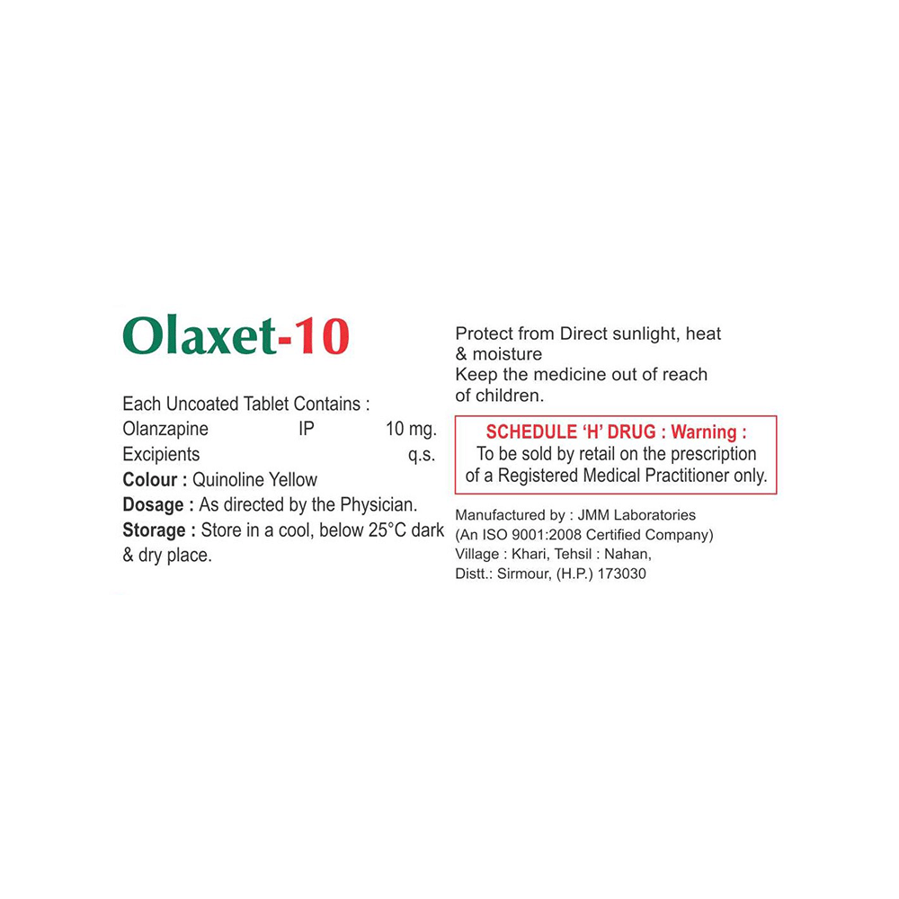 Olaxet 10 Tablet is used in the treatment of schizophrenia (a mental disorder that can result in hallucinations or delusions and also adversely affects a person’s ability to think and behave) and mania. Olaxet 10 Tablet may be taken with or without food. However, it is advised to take it at the same time each day as this helps to maintain a consistent level of medicine in the body. Take this medicine in the dose and duration as advised by your doctor and if you have missed a dose, take it as soon as you remember. This medication mustn't be stopped suddenly without talking to your doctor as it may worsen your symptoms.Some common side effects of this medicine include dryness in the mouth, constipation, muscle rigidity, and restlessness. Initially, this medicine may cause a sudden drop in blood pressure when you change positions, so it is better to rise slowly if you have been sitting or lying down. It also causes dizziness and sleepiness, so do not drive or do anything that requires mental focus until you know how this medicine affects you.However, this medicine may increase your weight, blood sugar, and cholesterol levels but, modifying your lifestyle by having a healthy diet and exercising regularly can reduce this side effect. You should be cautious as in rare cases it may cause serious side effects like very high blood sugar levels or seizures.