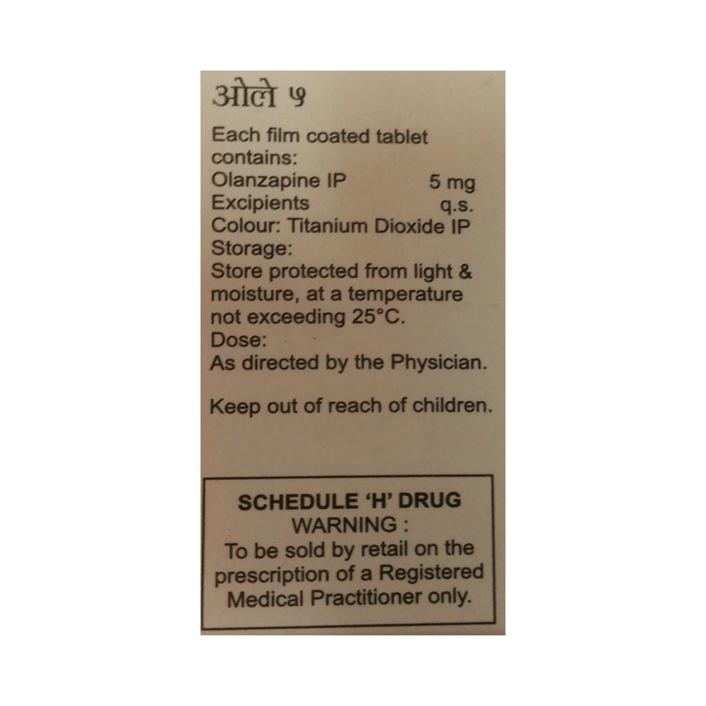 Olay 5 Tablet is used in the treatment of schizophrenia (a mental disorder that can result in hallucinations or delusions and also adversely affects a person’s ability to think and behave) and mania. Olay 5 Tablet may be taken with or without food. However, it is advised to take it at the same time each day as this helps to maintain a consistent level of medicine in the body. Take this medicine in the dose and duration as advised by your doctor and if you have missed a dose, take it as soon as you remember. This medication mustn't be stopped suddenly without talking to your doctor as it may worsen your symptoms.Some common side effects of this medicine include dryness in the mouth, constipation, muscle rigidity, and restlessness. Initially, this medicine may cause a sudden drop in blood pressure when you change positions, so it is better to rise slowly if you have been sitting or lying down. It also causes dizziness and sleepiness, so do not drive or do anything that requires mental focus until you know how this medicine affects you.However, this medicine may increase your weight, blood sugar, and cholesterol levels but, modifying your lifestyle by having a healthy diet and exercising regularly can reduce this side effect. You should be cautious as in rare cases it may cause serious side effects like very high blood sugar levels or seizures.