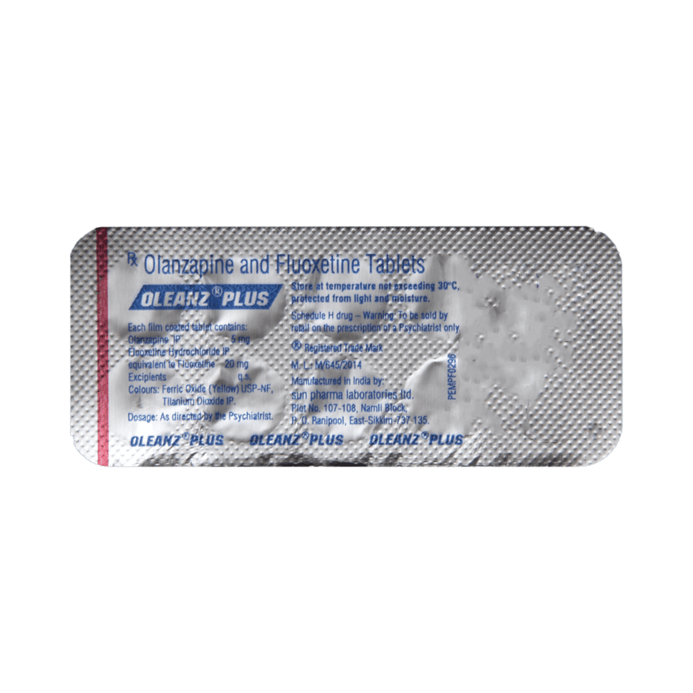 Oleanz Plus Tablet is a prescription medicine used in the treatment of depression associated with bipolar disorder. It works by increasing the level of chemical messengers in the brain, which improves mood and physical symptoms of depression. Oleanz Plus Tablet may be taken with or without food. Take it at the same time each day, as this helps maintain a consistent level of medicine in the body. Take this medicine in the dose and duration as advised by your doctor and do not miss a dose. This medication must not be stopped suddenly without talking to your doctor, as it may worsen your symptoms.Some common side effects of this medicine include dryness in the mouth, weight gain, and disturbance in attention. It may also cause dizziness and sleepiness. Do not drive or do anything that requires mental focus until you know how this medicine affects you. However, these symptoms are temporary and usually resolve on their own. Please consult your doctor if these do not subside or bother you.Before taking Oleanz Plus Tablet, inform your doctor if you are suffering from thyroid or kidney disease, epilepsy, Parkinson’s disease, glaucoma, or any heart disease. You should not take this medicine if you are under the influence of alcohol or any sleep-inducing, coughing, or allergy medication. You should avoid alcohol while taking Oleanz Plus Tablet, as it may worsen certain side effects.Oleanz Plus Tablet can also lead to weight gain, eat a healthy, balanced diet, avoid snacking with high-calorie food, and exercise regularly. Inform your doctor if you develop any unusual changes in mood or behavior, new or worsening depression, or suicidal thoughts or behavior.