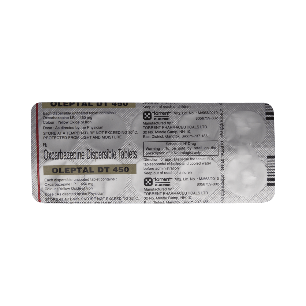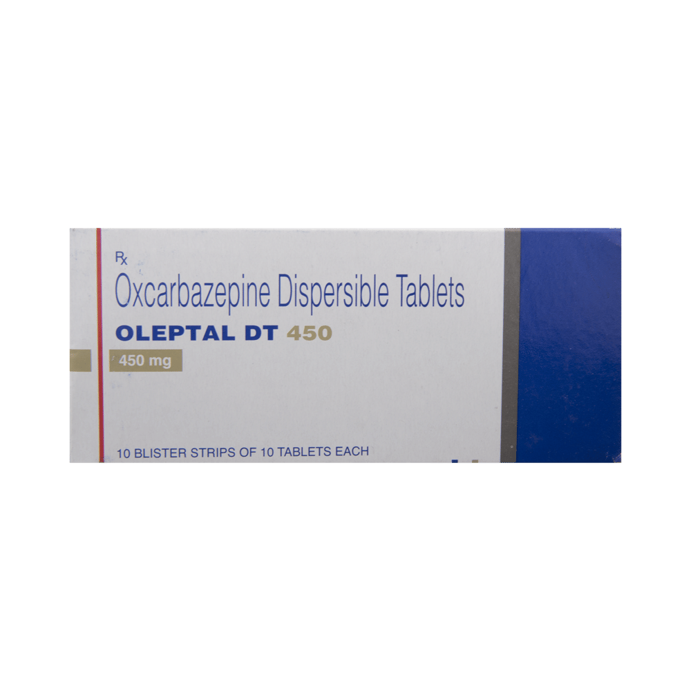 Oleptal DT 450 Tablet is used to treat and prevent epilepsy (seizures). However, it cannot cure epilepsy and will only work to prevent seizures for as long as you continue to take the medicine. Oleptal DT 450 Tablet may be used alone or in combination with other medicines. The dose and how often you need to take it will be decided by your doctor so that you get the right amount to control your symptoms. It may be increased gradually. You can take this medicine with or without food but take it at the same time each day to get the most benefit. It usually takes a couple of weeks to work. It is important to take this medicine regularly and for as long as you are advised, even if you feel well. Missing doses may trigger seizures and, if you stop, your condition may get worse. It should never be stopped suddenly.The most common side effects of this medicine include nausea, vomiting, feeling dizzy, tired or drowsy, unsteadiness, and low sodium levels in blood. Most of these are not serious. Keep taking the medicine but talk to your doctor if these side effects bother you or do not go away. However, if you notice a skin rash or redness, tell your doctor straight away. It could develop into a life-threatening skin condition called Stevens-Johnson syndrome. Long-term treatment with this medicine can cause osteoporosis (reduced bone mass) and increase your risk of breaking a bone. Anticonvulsants like this medicine may cause suicidal thoughts and behaviors. If your mood becomes depressed, tell your doctor.This medicine may not be suitable for everybody. Before using it, tell your doctor if you have ever had heart problems, kidney or liver disease, difficulty urinating, depression, or suicidal thoughts. Many other medicines can interfere with it and some should not be taken together so tell your doctor all the medicines you are taking to make sure it is safe. If you are pregnant, do not start or stop taking this medicine without asking your doctor. Drinking alcohol should be avoided as it can increase some of the side effects and can also increase your risk of seizures. You may need frequent blood tests to help your doctor make sure you are taking the right dose both before you start and while you are using it.