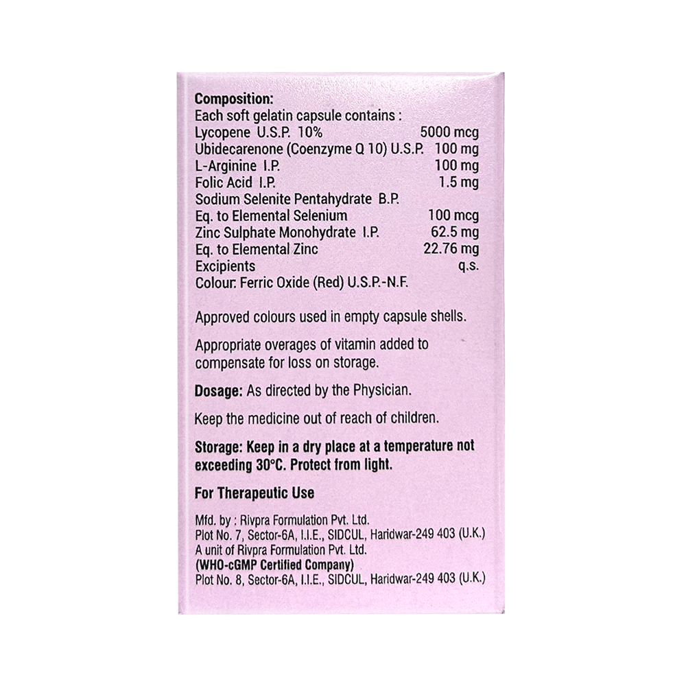 Salt Composition: Coenzyme Q10 (100mg) + Lycopene (5000mcg) + Zinc Sulphate Monohydrate (62.5mg) + Selenium (100mcg) + Folic Acid (1.5mg) + L-Arginine (100mg)