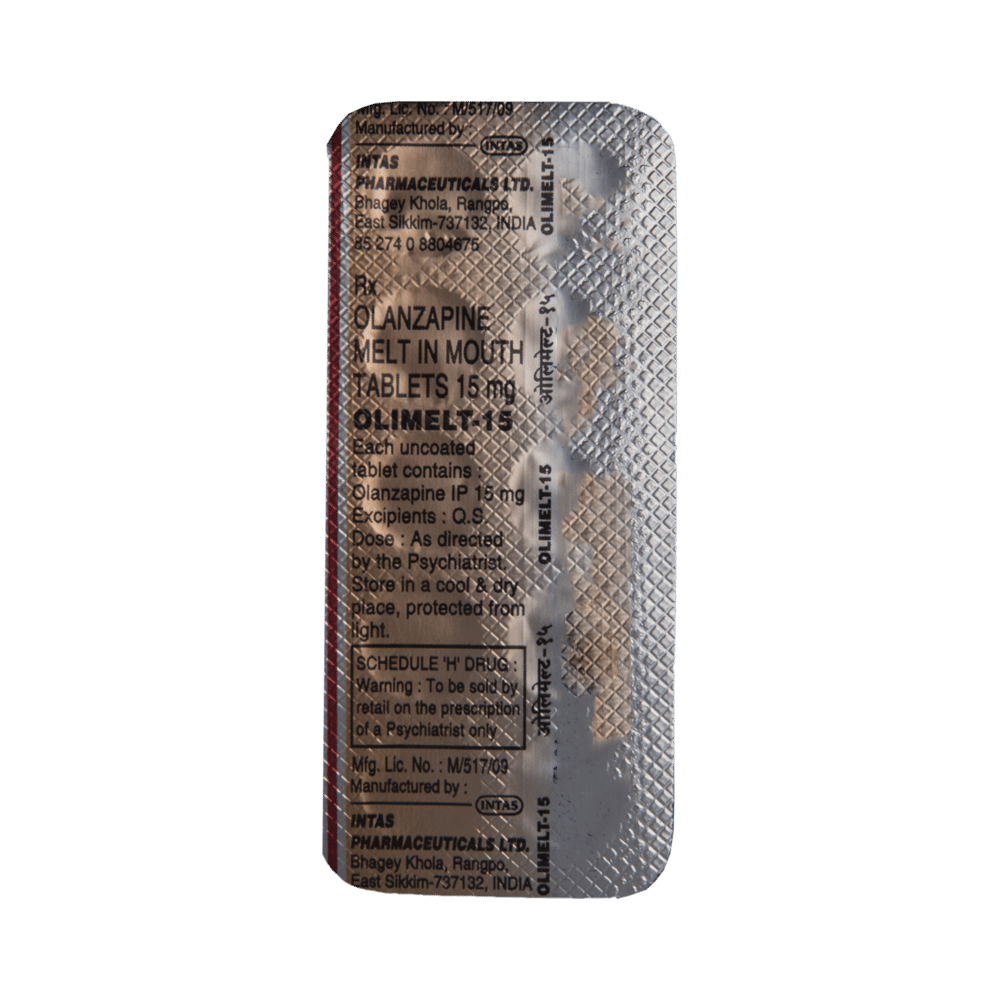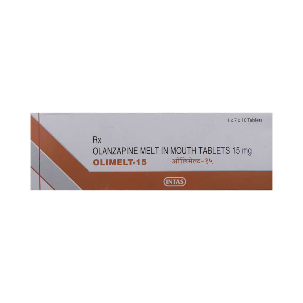 Olimelt 15 Tablet is used in the treatment of schizophrenia (a mental disorder that can result in hallucinations or delusions and also adversely affects a person’s ability to think and behave) and mania. Olimelt 15 Tablet may be taken with or without food. However, it is advised to take it at the same time each day as this helps to maintain a consistent level of medicine in the body. Take this medicine in the dose and duration as advised by your doctor and if you have missed a dose, take it as soon as you remember. This medication mustn't be stopped suddenly without talking to your doctor as it may worsen your symptoms.Some common side effects of this medicine include dryness in the mouth, constipation, muscle rigidity, and restlessness. Initially, this medicine may cause a sudden drop in blood pressure when you change positions, so it is better to rise slowly if you have been sitting or lying down. It also causes dizziness and sleepiness, so do not drive or do anything that requires mental focus until you know how this medicine affects you.However, this medicine may increase your weight, blood sugar, and cholesterol levels but, modifying your lifestyle by having a healthy diet and exercising regularly can reduce this side effect. You should be cautious as in rare cases it may cause serious side effects like very high blood sugar levels or seizures.