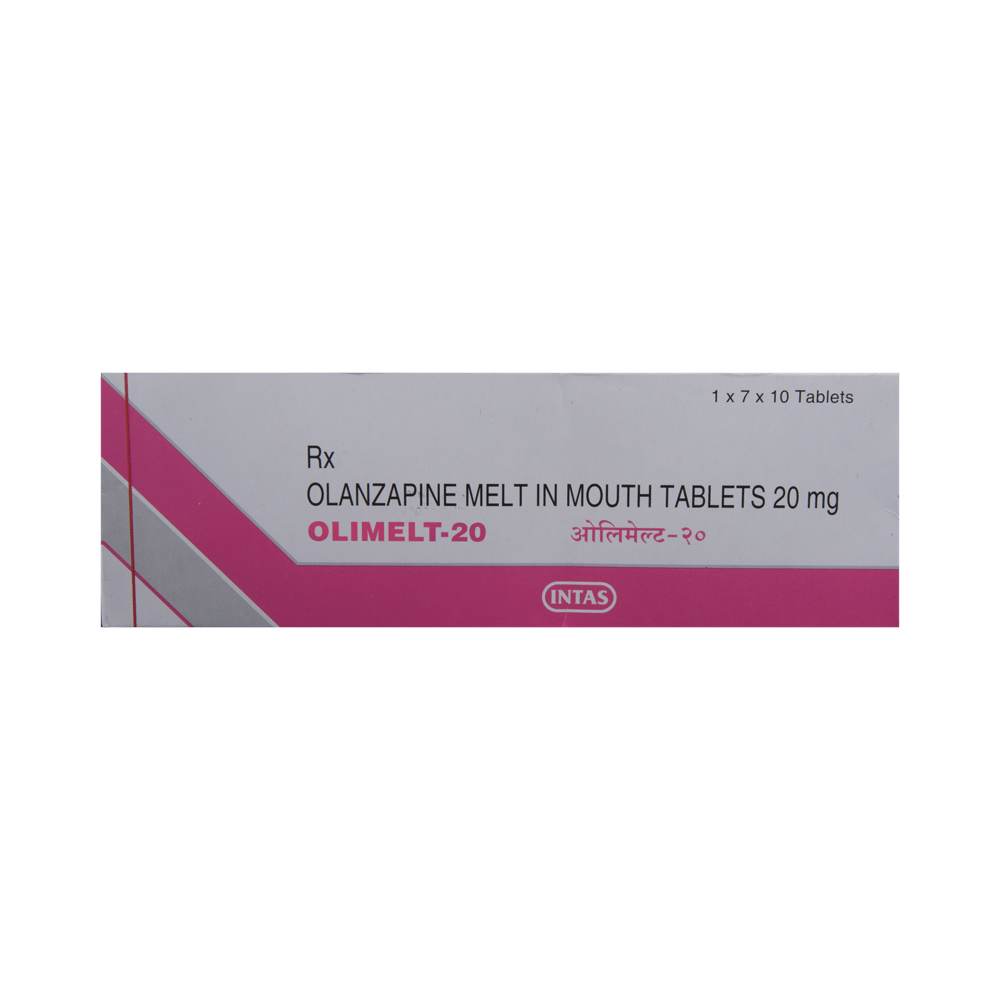 Olimelt 20 Tablet is used in the treatment of schizophrenia (a mental disorder that can result in hallucinations or delusions and also adversely affects a person’s ability to think and behave) and mania. Olimelt 20 Tablet may be taken with or without food. However, it is advised to take it at the same time each day as this helps to maintain a consistent level of medicine in the body. Take this medicine in the dose and duration as advised by your doctor and if you have missed a dose, take it as soon as you remember. This medication mustn't be stopped suddenly without talking to your doctor as it may worsen your symptoms.Some common side effects of this medicine include dryness in the mouth, constipation, muscle rigidity, and restlessness. Initially, this medicine may cause a sudden drop in blood pressure when you change positions, so it is better to rise slowly if you have been sitting or lying down. It also causes dizziness and sleepiness, so do not drive or do anything that requires mental focus until you know how this medicine affects you.However, this medicine may increase your weight, blood sugar, and cholesterol levels but, modifying your lifestyle by having a healthy diet and exercising regularly can reduce this side effect. You should be cautious as in rare cases it may cause serious side effects like very high blood sugar levels or seizures.