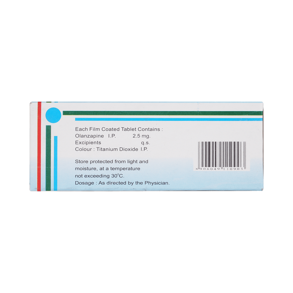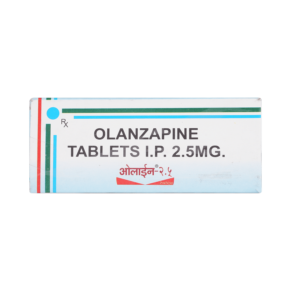 Oline 2.5mg Tablet is used in the treatment of schizophrenia (a mental disorder that can result in hallucinations or delusions and also adversely affects a person’s ability to think and behave) and mania. Oline 2.5mg Tablet may be taken with or without food. However, it is advised to take it at the same time each day as this helps to maintain a consistent level of medicine in the body. Take this medicine in the dose and duration as advised by your doctor and if you have missed a dose, take it as soon as you remember. This medication mustn't be stopped suddenly without talking to your doctor as it may worsen your symptoms.Some common side effects of this medicine include dryness in the mouth, constipation, muscle rigidity, and restlessness. Initially, this medicine may cause a sudden drop in blood pressure when you change positions, so it is better to rise slowly if you have been sitting or lying down. It also causes dizziness and sleepiness, so do not drive or do anything that requires mental focus until you know how this medicine affects you.However, this medicine may increase your weight, blood sugar, and cholesterol levels but, modifying your lifestyle by having a healthy diet and exercising regularly can reduce this side effect. You should be cautious as in rare cases it may cause serious side effects like very high blood sugar levels or seizures.