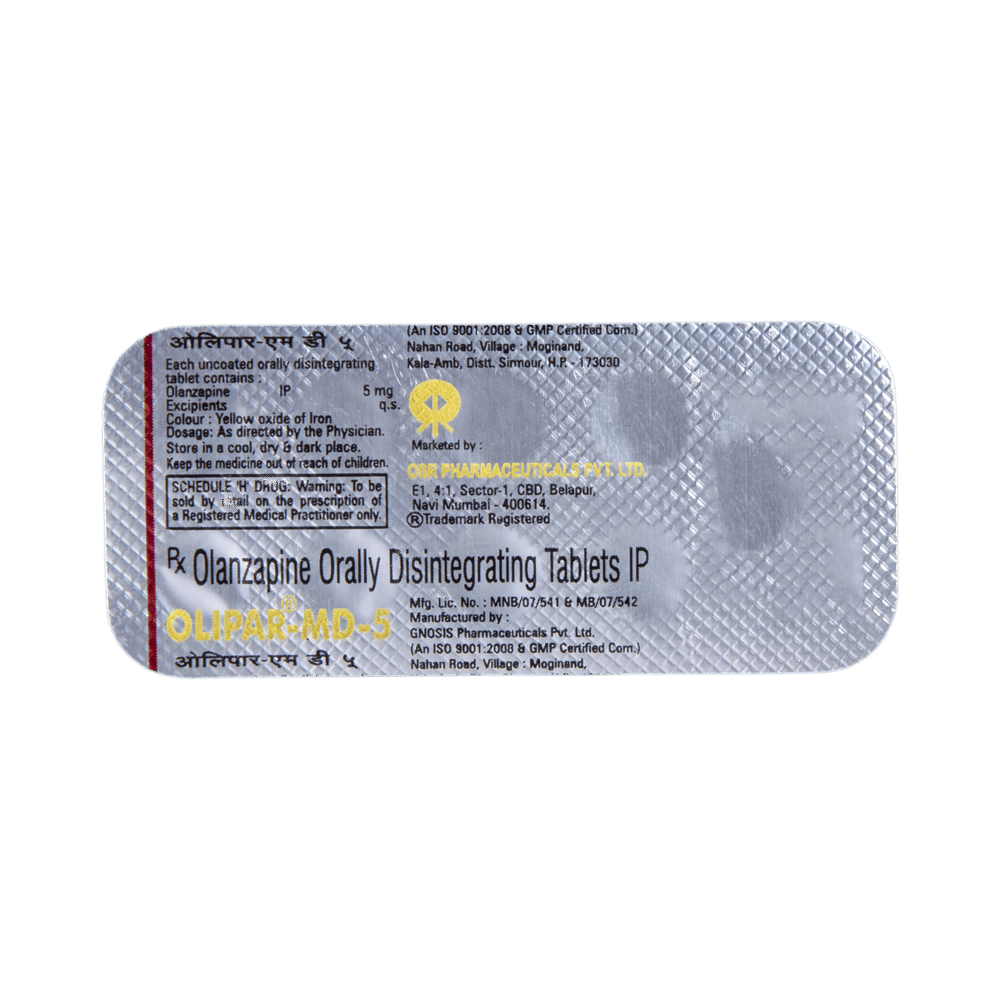 Olipar-MD 5 Tablet is used in the treatment of schizophrenia (a mental disorder that can result in hallucinations or delusions and also adversely affects a person’s ability to think and behave) and mania. Olipar-MD 5 Tablet may be taken with or without food. However, it is advised to take it at the same time each day as this helps to maintain a consistent level of medicine in the body. Take this medicine in the dose and duration as advised by your doctor and if you have missed a dose, take it as soon as you remember. This medication mustn't be stopped suddenly without talking to your doctor as it may worsen your symptoms.Some common side effects of this medicine include dryness in the mouth, constipation, muscle rigidity, and restlessness. Initially, this medicine may cause a sudden drop in blood pressure when you change positions, so it is better to rise slowly if you have been sitting or lying down. It also causes dizziness and sleepiness, so do not drive or do anything that requires mental focus until you know how this medicine affects you.However, this medicine may increase your weight, blood sugar, and cholesterol levels but, modifying your lifestyle by having a healthy diet and exercising regularly can reduce this side effect. You should be cautious as in rare cases it may cause serious side effects like very high blood sugar levels or seizures.