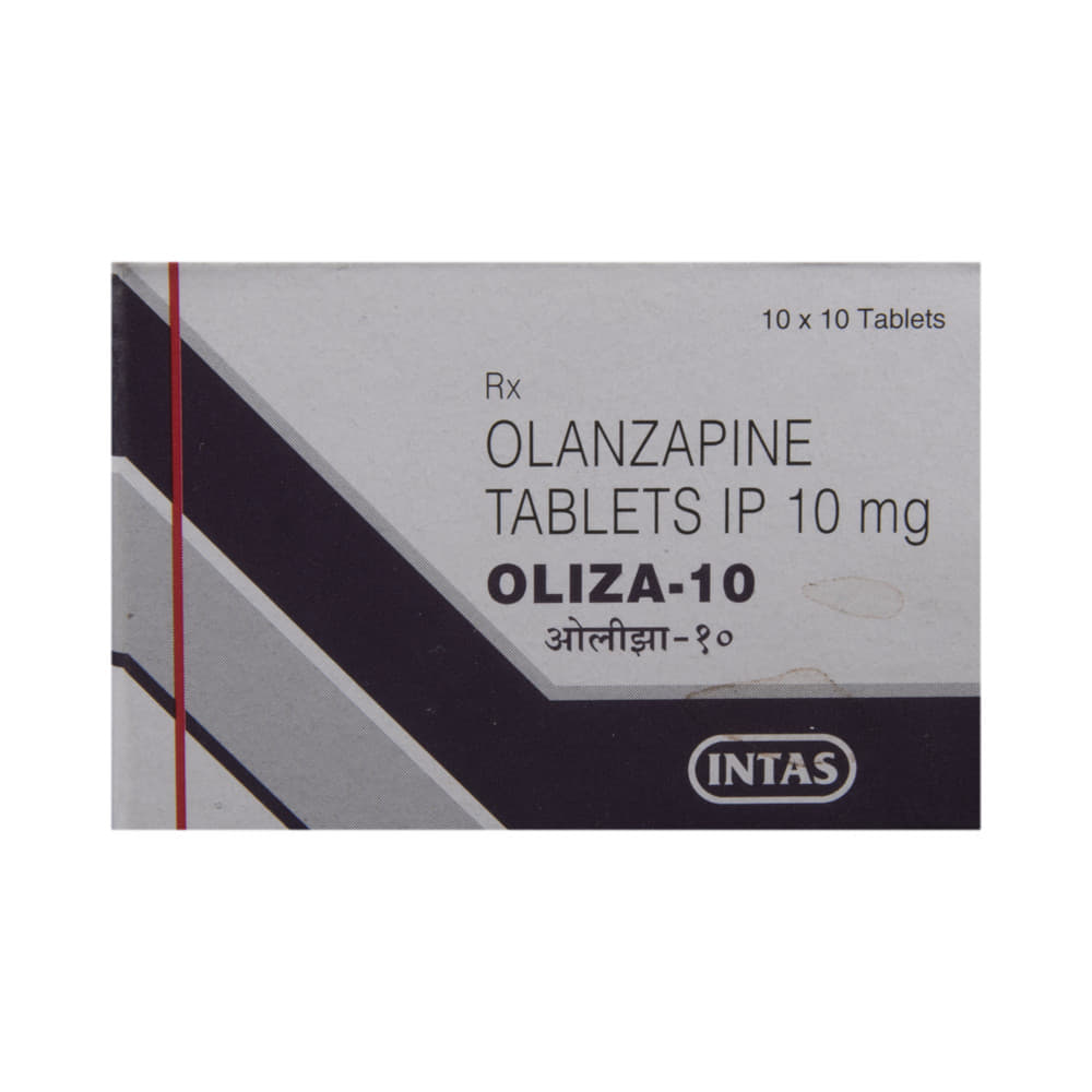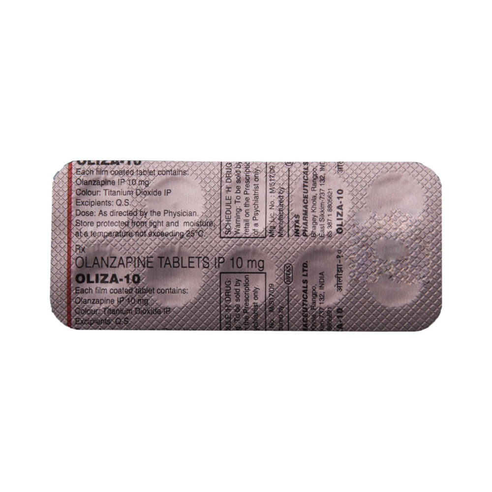 Oliza 10 Tablet is used in the treatment of schizophrenia (a mental disorder that can result in hallucinations or delusions and also adversely affects a person’s ability to think and behave) and mania. Oliza 10 Tablet may be taken with or without food. However, it is advised to take it at the same time each day as this helps to maintain a consistent level of medicine in the body. Take this medicine in the dose and duration as advised by your doctor and if you have missed a dose, take it as soon as you remember. This medication mustn't be stopped suddenly without talking to your doctor as it may worsen your symptoms.Some common side effects of this medicine include dryness in the mouth, constipation, muscle rigidity, and restlessness. Initially, this medicine may cause a sudden drop in blood pressure when you change positions, so it is better to rise slowly if you have been sitting or lying down. It also causes dizziness and sleepiness, so do not drive or do anything that requires mental focus until you know how this medicine affects you.However, this medicine may increase your weight, blood sugar, and cholesterol levels but, modifying your lifestyle by having a healthy diet and exercising regularly can reduce this side effect. You should be cautious as in rare cases it may cause serious side effects like very high blood sugar levels or seizures.