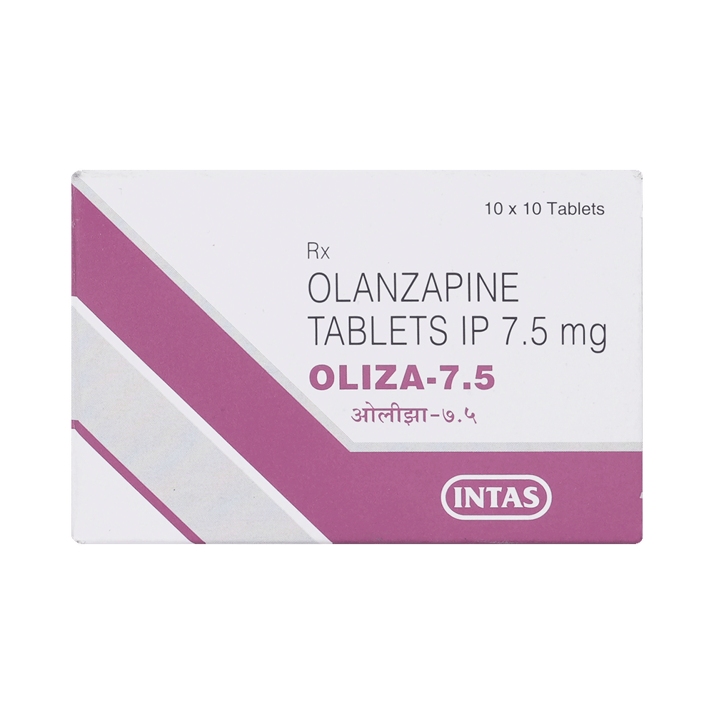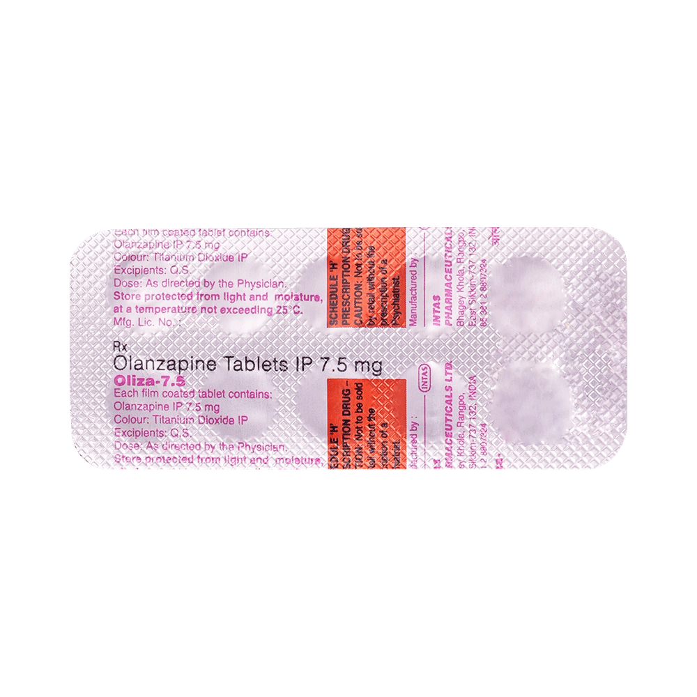 Oliza 7.5mg Tablet is used in the treatment of schizophrenia (a mental disorder that can result in hallucinations or delusions and also adversely affects a person’s ability to think and behave) and mania. Oliza 7.5mg Tablet may be taken with or without food. However, it is advised to take it at the same time each day as this helps to maintain a consistent level of medicine in the body. Take this medicine in the dose and duration as advised by your doctor and if you have missed a dose, take it as soon as you remember. This medication mustn't be stopped suddenly without talking to your doctor as it may worsen your symptoms.Some common side effects of this medicine include dryness in the mouth, constipation, muscle rigidity, and restlessness. Initially, this medicine may cause a sudden drop in blood pressure when you change positions, so it is better to rise slowly if you have been sitting or lying down. It also causes dizziness and sleepiness, so do not drive or do anything that requires mental focus until you know how this medicine affects you.However, this medicine may increase your weight, blood sugar, and cholesterol levels but, modifying your lifestyle by having a healthy diet and exercising regularly can reduce this side effect. You should be cautious as in rare cases it may cause serious side effects like very high blood sugar levels or seizures.