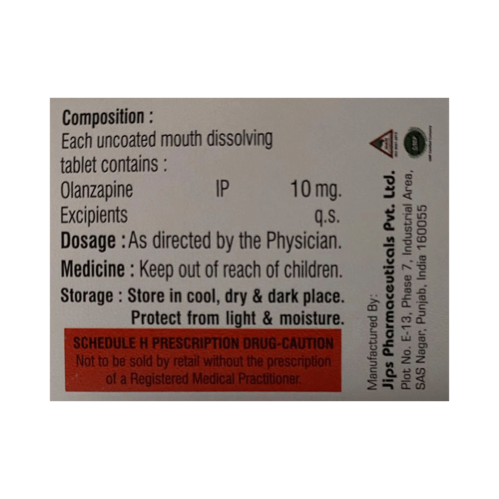 Olizoy MD 10 Tablet is used in the treatment of schizophrenia (a mental disorder that can result in hallucinations or delusions and also adversely affects a person’s ability to think and behave) and mania. Olizoy MD 10 Tablet may be taken with or without food. However, it is advised to take it at the same time each day as this helps to maintain a consistent level of medicine in the body. Take this medicine in the dose and duration as advised by your doctor and if you have missed a dose, take it as soon as you remember. This medication mustn't be stopped suddenly without talking to your doctor as it may worsen your symptoms.Some common side effects of this medicine include dryness in the mouth, constipation, muscle rigidity, and restlessness. Initially, this medicine may cause a sudden drop in blood pressure when you change positions, so it is better to rise slowly if you have been sitting or lying down. It also causes dizziness and sleepiness, so do not drive or do anything that requires mental focus until you know how this medicine affects you.However, this medicine may increase your weight, blood sugar, and cholesterol levels but, modifying your lifestyle by having a healthy diet and exercising regularly can reduce this side effect. You should be cautious as in rare cases it may cause serious side effects like very high blood sugar levels or seizures.
