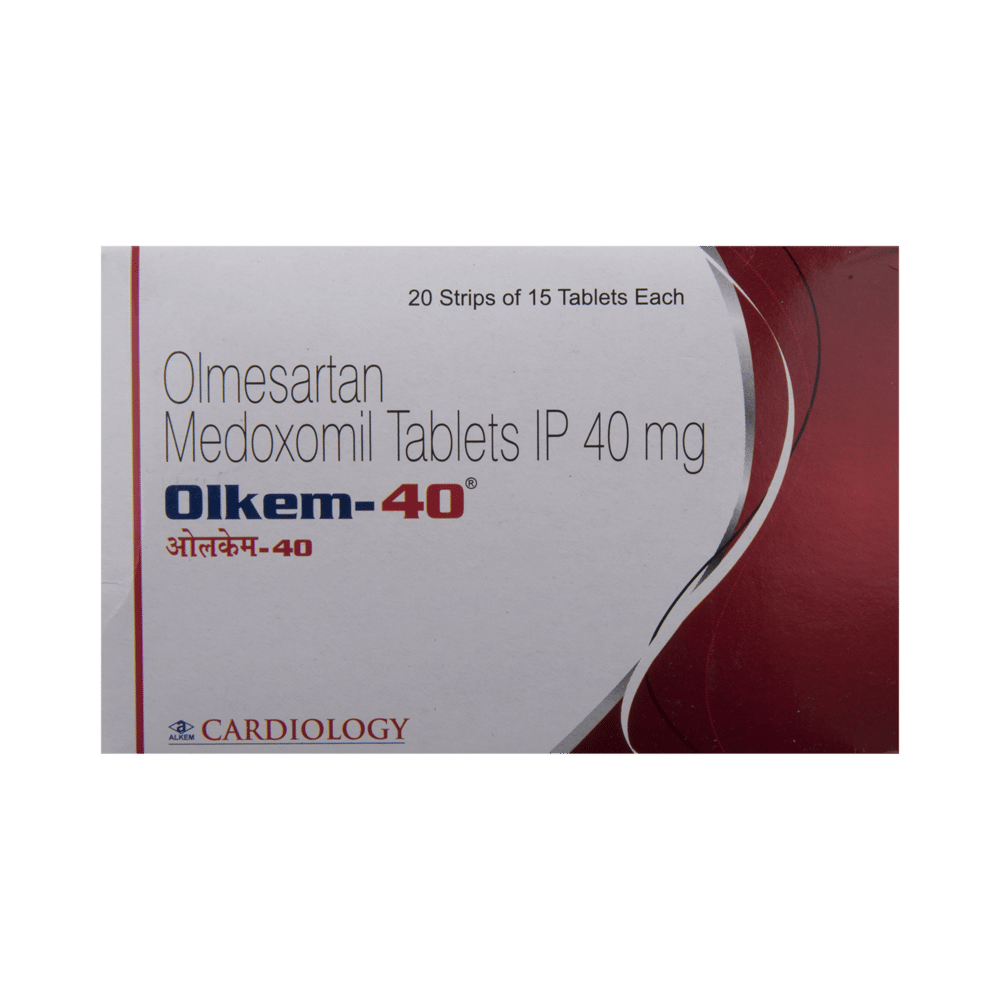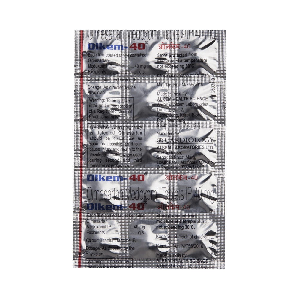 Olkem 40 Tablet is a medicine used in the treatment of hypertension (high blood pressure). Lowering blood pressure helps prevent future heart attacks and strokes. This medicine is also effective in preserving kidney function in patients with diabetes. Olkem 40 Tablet may be prescribed either alone or in combination with other medicines. It may be taken with or without food during the day or at night. However, try to take it at about the same time each day to get the maximum benefit. It is important to continue taking it regularly even if you feel well or if your blood pressure is controlled. Most people with high blood pressure do not feel ill, but if you stop taking this medicine, your condition could get worse.Making some changes in your lifestyle will also help lower your blood pressure. These may include regular exercise, losing weight, smoking cessation, reducing alcohol intake, and reducing the amount of salt in your diet as advised by your doctor. This medicine is tolerated well by most patients and has few side effects. However, some may experience side effects like dizziness, cough, diarrhea, indigestion, nausea, and a runny nose, particularly after the first dose. Let your doctor know if this bothers you or does not go away.Before taking this medicine, let your doctor know if you have any kidney or liver problems. Pregnant or breastfeeding mothers should not take this medicine. Your doctor may check your kidney function, blood pressure, and potassium levels in your blood at regular intervals while you are taking this medicine.