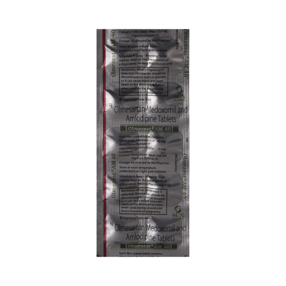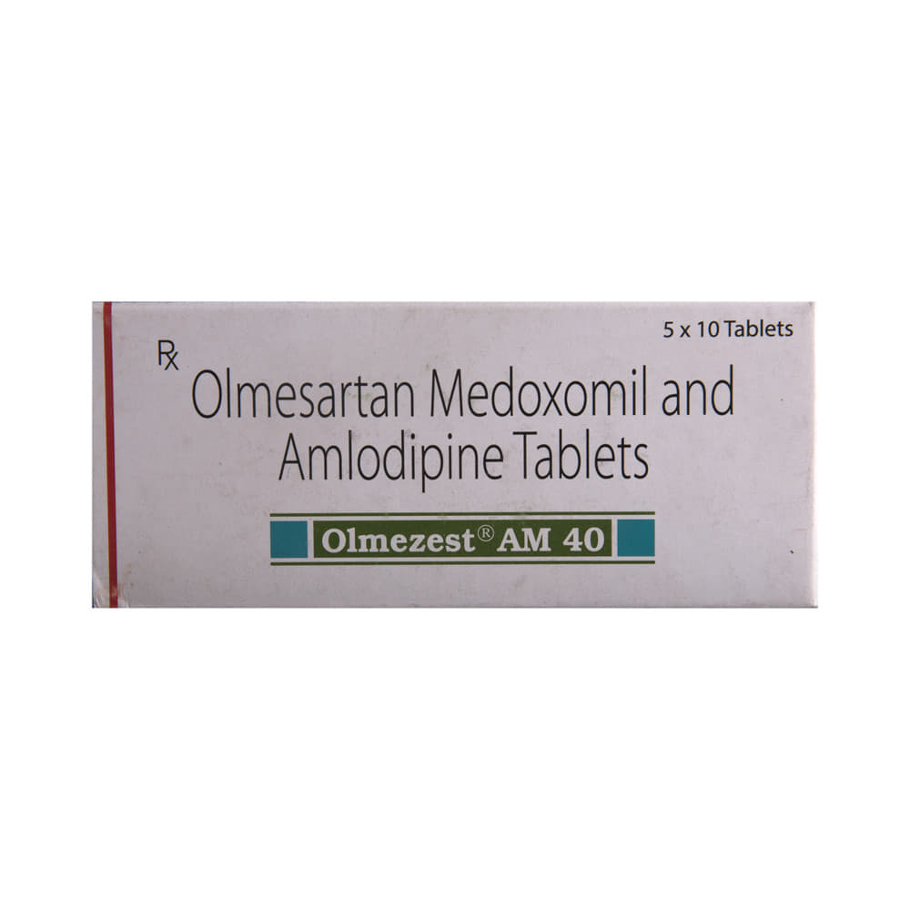Olmezest AM 40 Tablet contains two medicines, both of which help to control high blood pressure. Lowering blood pressure helps to reduce your risk of having a heart attack or a stroke in the future. Olmezest AM 40 Tablet may be taken on an empty stomach or along with food. However, it is better to take it regularly at a fixed time each day, as prescribed by your doctor. The dose will depend on your condition and how you respond to the medicine. It is important to keep taking this medicine even if you feel well. By lowering your blood pressure, it is reducing your risk of heart attack or stroke so do not stop taking it unless your doctor tells you to. You can help this medication work better by making a few changes to your lifestyle by being active, stopping smoking and eating low salt and low-fat diet.The most common side effects of this medicine include swelling in your ankles or feet (edema), sleepiness, dizziness, headache, taste change, upset stomach, and tiredness. Since it may cause sleepiness and dizziness, do not drive or do anything requiring concentration until you know how it affects you. Talk to your doctor if any of the side effects bother you or do not go away.Before taking this medicine, let your doctor know if you have any kidney or liver problems or severe dehydration. Pregnant or breastfeeding women should also consult their doctor before taking it. While using this medicine, your blood pressure will be monitored regularly and your kidney function may also need to be tested.