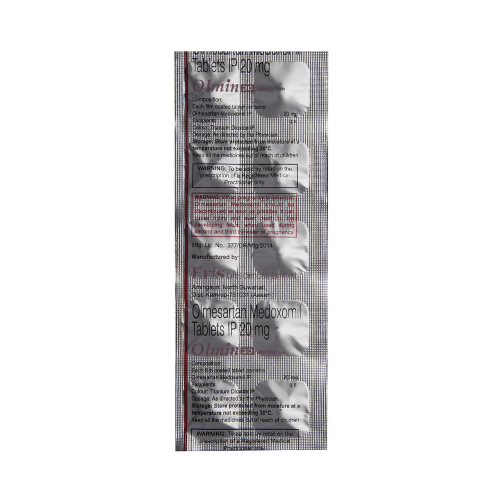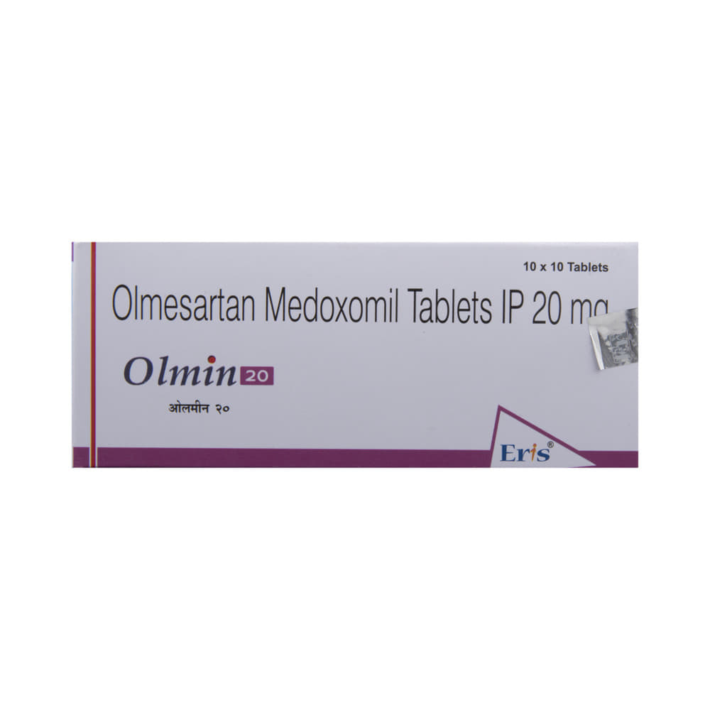 OlmIN 20 Tablet is a medicine used in the treatment of hypertension (high blood pressure). Lowering blood pressure helps prevent future heart attacks and strokes. This medicine is also effective in preserving kidney function in patients with diabetes. OlmIN 20 Tablet may be prescribed either alone or in combination with other medicines. It may be taken with or without food during the day or at night. However, try to take it at about the same time each day to get the maximum benefit. It is important to continue taking it regularly even if you feel well or if your blood pressure is controlled. Most people with high blood pressure do not feel ill, but if you stop taking this medicine, your condition could get worse.Making some changes in your lifestyle will also help lower your blood pressure. These may include regular exercise, losing weight, smoking cessation, reducing alcohol intake, and reducing the amount of salt in your diet as advised by your doctor. This medicine is tolerated well by most patients and has few side effects. However, some may experience side effects like dizziness, cough, diarrhea, indigestion, nausea, and a runny nose, particularly after the first dose. Let your doctor know if this bothers you or does not go away.Before taking this medicine, let your doctor know if you have any kidney or liver problems. Pregnant or breastfeeding mothers should not take this medicine. Your doctor may check your kidney function, blood pressure, and potassium levels in your blood at regular intervals while you are taking this medicine.