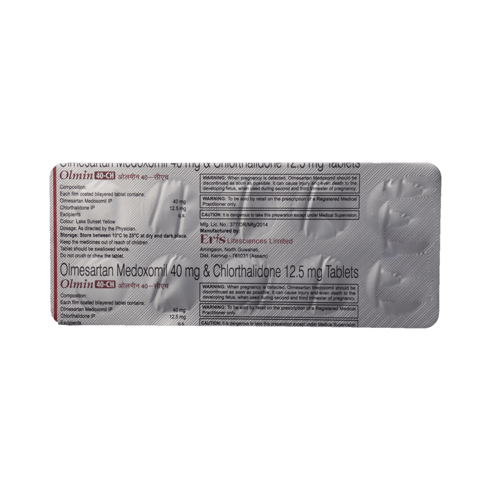 Olmin 40-CH Tablet is a combination of two medicines. It helps to control high blood pressure in different ways. If high blood pressure is not treated it can lead to heart attacks, strokes and kidney failure. You can take Olmin 40-CH Tablet with or without food. The dose will depend on your condition and how you respond to the medicine. Try to take it at the same time each day. It is important to keep taking this medicine until your doctor tells you not to. It contains a diuretic (water pill) and will make you urinate more so, it is best to avoid taking this medicine within four hours of going to bed. Use this medicine regularly to get the most benefit from it even if you feel well. High blood pressure does not usually have symptoms and if you stop taking it your risk of heart attack or stroke may increase.The most common side effect is dizziness. Other side effects include feeling tired, nausea, diarrhea, headache, and decreased blood pressure. Frequent urination is not a side effect of this medicine. It is the purpose of chlorthalidone and helps control your blood pressure. You may experience other possible side effects, but most are rare. Make sure you read the leaflet that comes with your medicines and tell your doctor if you are bothered by side effects or they do not go away. It may be possible to adjust your dose or try a different medicine.This medicine is not recommended during pregnancy and you should ask your doctor before taking it if you have kidney or liver disease, heart trouble or diabetes. Drinking alcohol can further lower your blood pressure and may cause side effects.