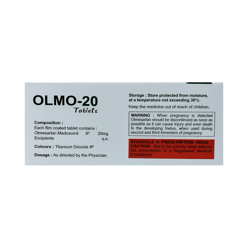 Olmo 20 Tablet is a medicine used in the treatment of hypertension (high blood pressure). Lowering blood pressure helps prevent future heart attacks and strokes. This medicine is also effective in preserving kidney function in patients with diabetes. Olmo 20 Tablet may be prescribed either alone or in combination with other medicines. It may be taken with or without food during the day or at night. However, try to take it at about the same time each day to get the maximum benefit. It is important to continue taking it regularly even if you feel well or if your blood pressure is controlled. Most people with high blood pressure do not feel ill, but if you stop taking this medicine, your condition could get worse.Making some changes in your lifestyle will also help lower your blood pressure. These may include regular exercise, losing weight, smoking cessation, reducing alcohol intake, and reducing the amount of salt in your diet as advised by your doctor. This medicine is tolerated well by most patients and has few side effects. However, some may experience side effects like dizziness, cough, diarrhea, indigestion, nausea, and a runny nose, particularly after the first dose. Let your doctor know if this bothers you or does not go away.Before taking this medicine, let your doctor know if you have any kidney or liver problems. Pregnant or breastfeeding mothers should not take this medicine. Your doctor may check your kidney function, blood pressure, and potassium levels in your blood at regular intervals while you are taking this medicine.