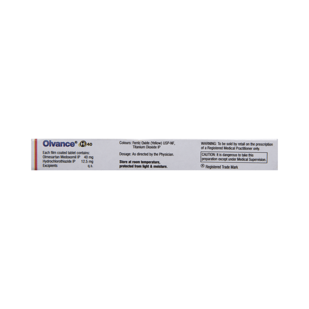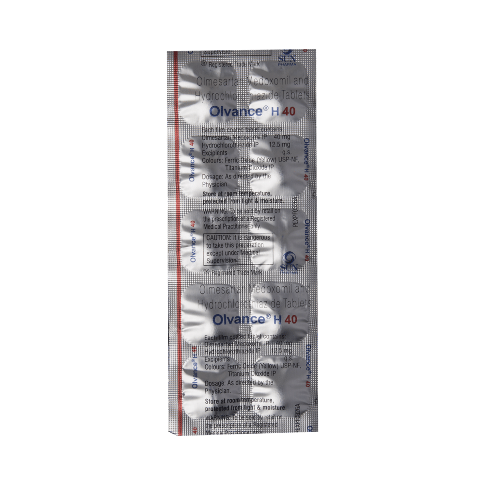 In Hypertension (high blood pressure)Olvance H 40 Tablet is a combination of two medicines namely Olmesartan and Hydrochlorothiazide. It is generally used when one medicine alone is not controlling your blood pressure effectively. Olmesartan works by relaxing and widening your blood vessels so your blood can flow more easily. This will lower your blood pressure. Hydrochlorothiazide is known as a diuretic (water pill) which increases urine output thereby lowering blood pressure. If your blood pressure is controlled you are less at risk of having a heart attack, stroke, or kidney problems. The medicine must be taken regularly as prescribed to be effective. You do not usually feel any direct benefit from taking this medicine, but it works in the long term to keep you well.