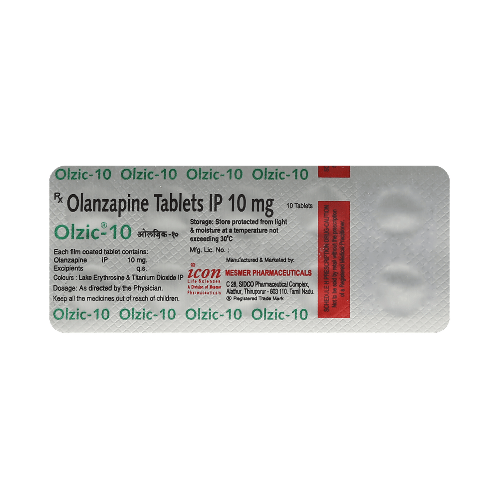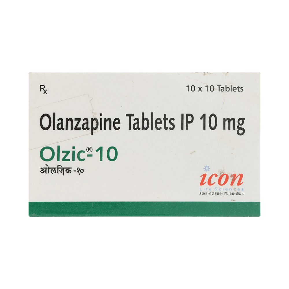 Olzic 10mg Tablet is used in the treatment of schizophrenia (a mental disorder that can result in hallucinations or delusions and also adversely affects a person’s ability to think and behave) and mania. Olzic 10mg Tablet may be taken with or without food. However, it is advised to take it at the same time each day as this helps to maintain a consistent level of medicine in the body. Take this medicine in the dose and duration as advised by your doctor and if you have missed a dose, take it as soon as you remember. This medication mustn't be stopped suddenly without talking to your doctor as it may worsen your symptoms.Some common side effects of this medicine include dryness in the mouth, constipation, muscle rigidity, and restlessness. Initially, this medicine may cause a sudden drop in blood pressure when you change positions, so it is better to rise slowly if you have been sitting or lying down. It also causes dizziness and sleepiness, so do not drive or do anything that requires mental focus until you know how this medicine affects you.However, this medicine may increase your weight, blood sugar, and cholesterol levels but, modifying your lifestyle by having a healthy diet and exercising regularly can reduce this side effect. You should be cautious as in rare cases it may cause serious side effects like very high blood sugar levels or seizures.