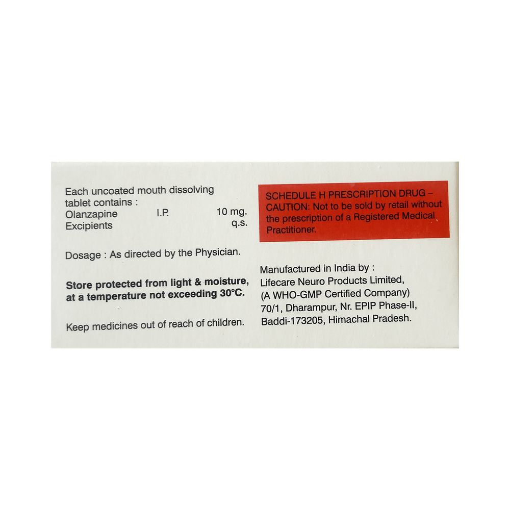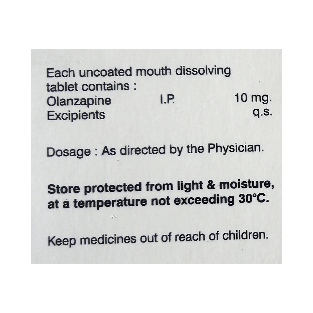 Olzimost 10 Tablet MD is used in the treatment of schizophrenia (a mental disorder that can result in hallucinations or delusions and also adversely affects a person’s ability to think and behave) and mania. Olzimost 10 Tablet MD may be taken with or without food. However, it is advised to take it at the same time each day as this helps to maintain a consistent level of medicine in the body. Take this medicine in the dose and duration as advised by your doctor and if you have missed a dose, take it as soon as you remember. This medication mustn't be stopped suddenly without talking to your doctor as it may worsen your symptoms.Some common side effects of this medicine include dryness in the mouth, constipation, muscle rigidity, and restlessness. Initially, this medicine may cause a sudden drop in blood pressure when you change positions, so it is better to rise slowly if you have been sitting or lying down. It also causes dizziness and sleepiness, so do not drive or do anything that requires mental focus until you know how this medicine affects you.However, this medicine may increase your weight, blood sugar, and cholesterol levels but, modifying your lifestyle by having a healthy diet and exercising regularly can reduce this side effect. You should be cautious as in rare cases it may cause serious side effects like very high blood sugar levels or seizures.