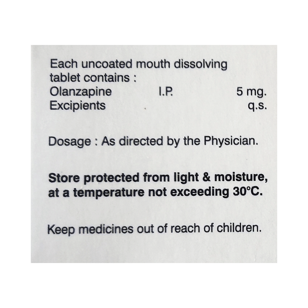 Olzimost 5 Tablet MD is used in the treatment of schizophrenia (a mental disorder that can result in hallucinations or delusions and also adversely affects a person’s ability to think and behave) and mania. Olzimost 5 Tablet MD may be taken with or without food. However, it is advised to take it at the same time each day as this helps to maintain a consistent level of medicine in the body. Take this medicine in the dose and duration as advised by your doctor and if you have missed a dose, take it as soon as you remember. This medication mustn't be stopped suddenly without talking to your doctor as it may worsen your symptoms.Some common side effects of this medicine include dryness in the mouth, constipation, muscle rigidity, and restlessness. Initially, this medicine may cause a sudden drop in blood pressure when you change positions, so it is better to rise slowly if you have been sitting or lying down. It also causes dizziness and sleepiness, so do not drive or do anything that requires mental focus until you know how this medicine affects you.However, this medicine may increase your weight, blood sugar, and cholesterol levels but, modifying your lifestyle by having a healthy diet and exercising regularly can reduce this side effect. You should be cautious as in rare cases it may cause serious side effects like very high blood sugar levels or seizures.
