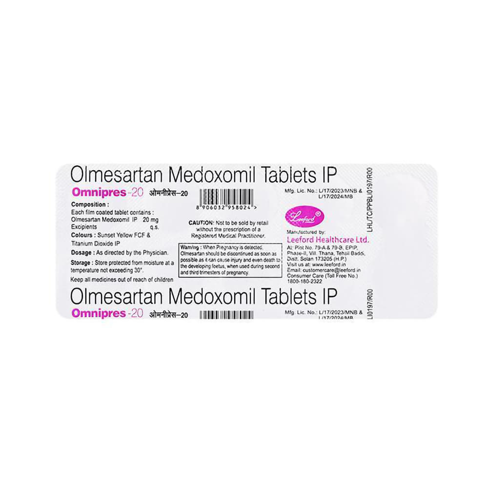Omnipres 20mg Tablet is an angiotensin receptor blocker (ARB). It relaxes the blood vessels by blocking the action of a chemical that usually makes blood vessels tighter. This lowers the blood pressure, allowing the blood to flow more smoothly to different organs and the heart to pump more efficiently.