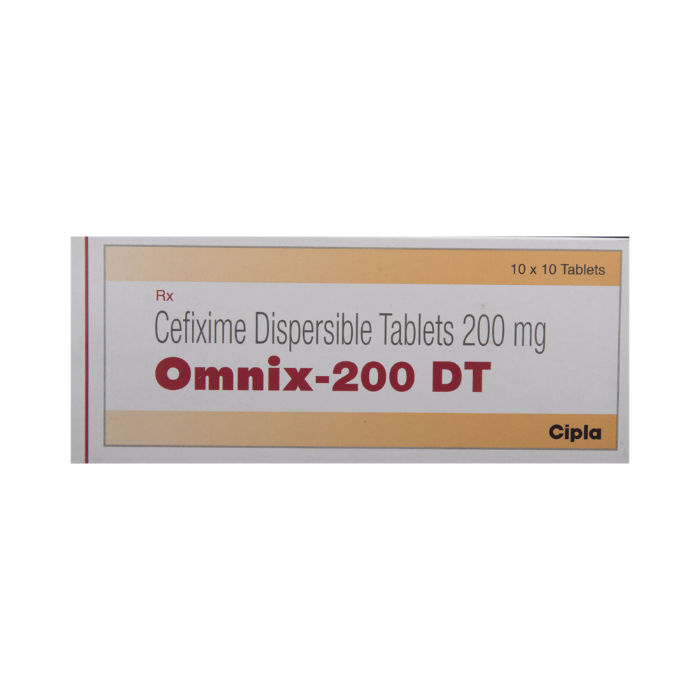 Omnix 200 DT Tablet is an antibiotic belonging that is used to treat a variety of bacterial infections. It is effective in infections of the respiratory tract (eg. pneumonia), urinary tract, ear, nasal sinus, throat, and some sexually transmitted diseases. Omnix 200 DT Tablet should be given under the supervision of a doctor or health professional. Use it regularly at evenly spaced intervals as per the schedule prescribed by your doctor. Using it at the same time every day will help you remember to take it. The dose will depend on what you are being treated for, but you should always complete the full course of this antibiotic as prescribed by your doctor. Do not stop taking it until you have finished, even when you feel better. If you stop taking it early, some bacteria may survive and the infection may come back or worsen. It will not work for viral infections such as flu or common cold. Using any antibiotic when you do not need it can make it less effective for future infections.The most common side effects of this medicine include nausea, stomach pain, indigestion, and diarrhea. These are usually mild but let your doctor know if they bother you or do not go away.Before taking it, you should let your doctor know if you are allergic to any antibiotics or have any kidney or liver problems. You should also let your healthcare team know all other medicines you are taking as they may affect, or be affected by this medicine. This medicine is generally regarded as safe to use during pregnancy and breastfeeding if prescribed by a doctor.