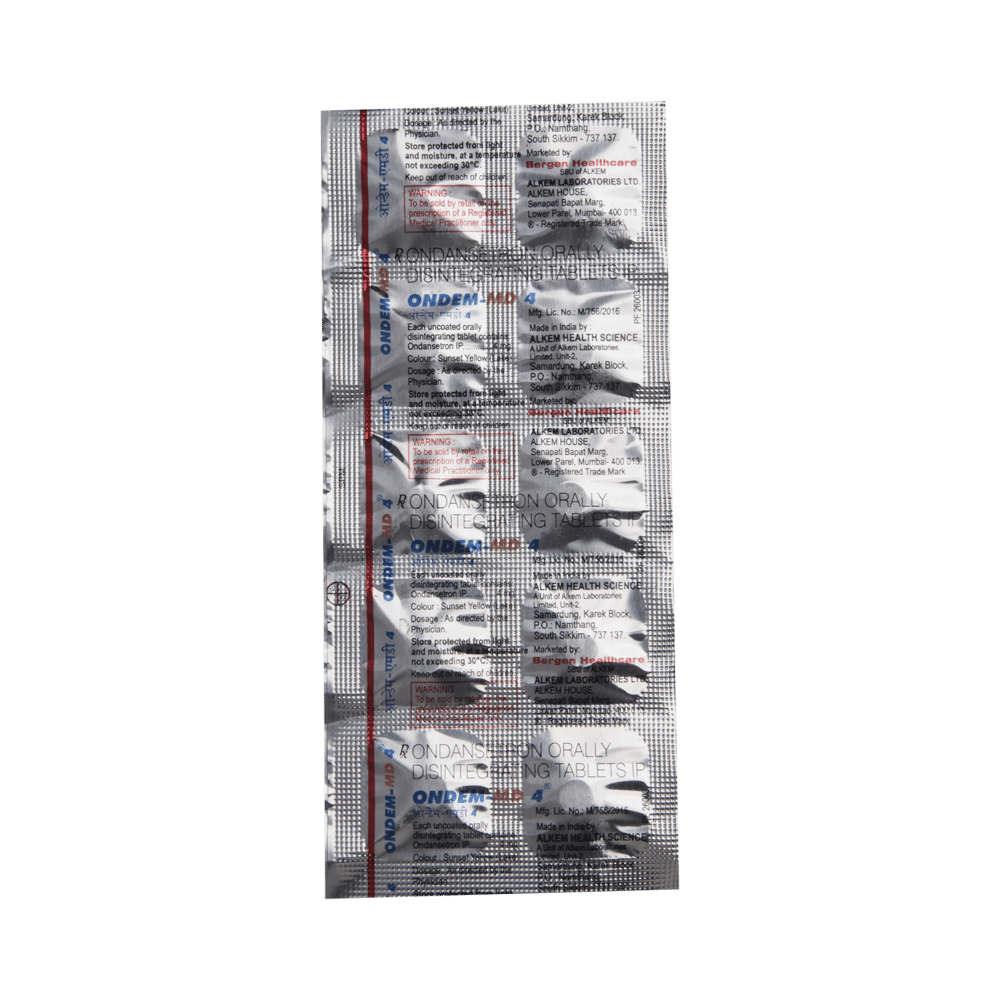 Ondem -MD 4 Tablet is a medicine used to control nausea and vomiting due to certain medical conditions like stomach upset. It is also used to prevent nausea and vomiting caused due to surgery, cancer drug therapy, or radiotherapy. Ondem -MD 4 Tablet may be used alone or with other medications and can be taken with or without food. Your doctor will suggest the appropriate dose depending on what you are taking it for. The first dose is normally taken before the start of surgery, chemotherapy, or radiotherapy. After these treatments, take any further doses as prescribed by your doctor (normally only for a few days at most). Take it regularly at the same time(s) each day to get the most benefit. Be careful not to take too much.Ondem -MD 4 Tablet does not relieve other side effects associated with cancer treatments. Also, it has little effect on vomiting caused by motion sickness. The most common side effects of taking this medicine include headache, diarrhea or constipation, and feeling tired. These symptoms should disappear when you stop taking the medicine. However, if these side effects bother you or do not go away, your doctor may be able to suggest ways of preventing or reducing them.Before taking Ondem -MD 4 Tablet, tell your doctor if you have heart or liver problems or a blockage in your stomach or intestines. Also, tell your doctor about any other medicines you might be taking, especially medicines to treat epilepsy, heart problems, cancer, and depression. These may affect, or be affected by, this medicine. If you are pregnant or breastfeeding, ask for advice from your doctor.