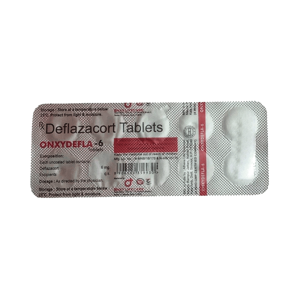Onxydefla 6 Tablet belongs to a group of medicines called steroids. It is used for the treatment of various diseases and conditions such as inflammatory conditions and autoimmune conditions. Onxydefla 6 Tablet works by inhibiting the release of substances that cause swelling or by changing how the immune system works. It can be taken on an empty stomach or after food. Taking the medicine regularly at the right times increases its effectiveness. It is important to keep taking the medicine regularly until your doctor tells you it is safe to stop.Use of this medicine may cause some common side effects such as increased appetite, weight gain, frequent urge to urinate, Cushing syndrome, cough, upper respiratory tract infection, abnormal hair growth, obesity, and nasopharyngitis. If any of these side effects bother you, let your doctor know.Onxydefla 6 Tablet can make it harder for you to fight off infections. Tell your doctor if you have any signs of infection such as a fever or sore throat. Before taking the medicine, you should let your doctor know of all the other medicines you are taking. Pregnant and breastfeeding women should consult their doctors before taking the medicine.
