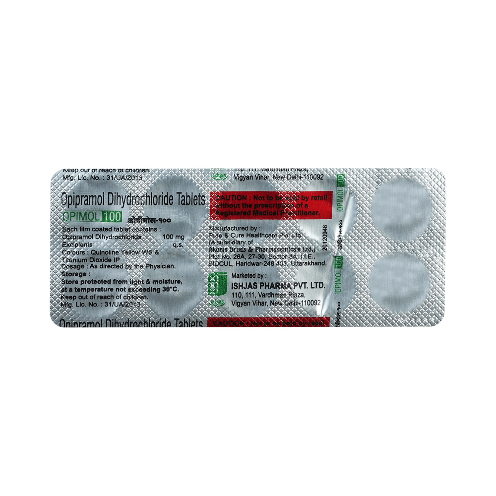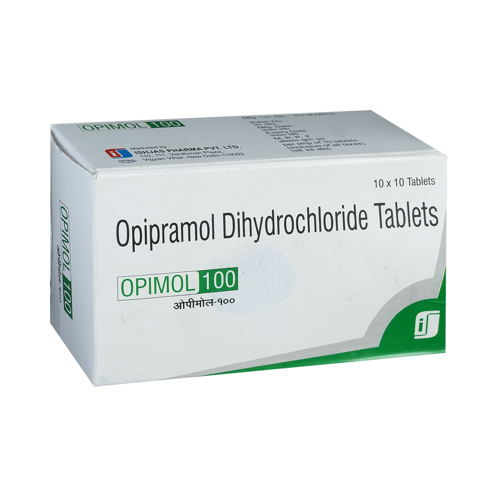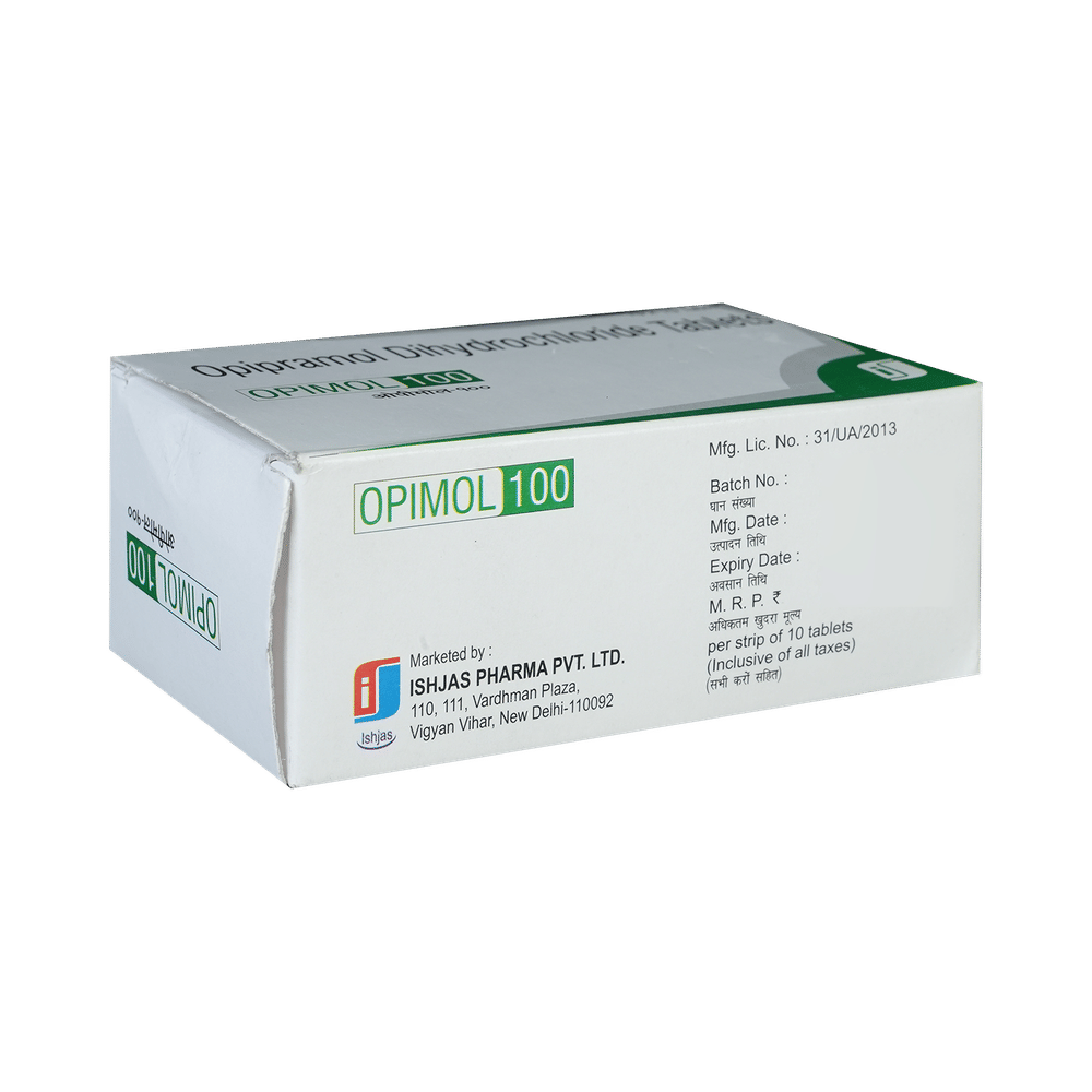 Opimol 100mg Tablet is a prescription medicine used in the treatment of anxiety disorders. It also helps in restoring the messengers that elevate the mood. Opimol 100mg Tablet may be taken with or without food. However, it is advised to take it at a fixed time each day to maintain a consistent level of medicine in the blood. If you have missed a dose, take it as soon as you remember and finish the full course of treatment even if you feel better. This medication must not be stopped suddenly without talking to your doctor, as it may worsen your symptoms.Some common side effects of this medicine include nasal congestion, fatigue, and dryness in the mouth. Initially, this medicine may cause a sudden drop in blood pressure when you change positions, so it is better to rise slowly if you have been sitting or lying down. It even causes dizziness and sleepiness, so do not drive or do anything that requires mental focus until you know how this medicine affects you.It is important to inform your doctor if you develop any unusual mood changes, as it may lead to suicidal thoughts. If you have been taking this medicine for a long time, regular monitoring of liver function may be required. Inform your doctor if you have any health conditions associated with the liver, kidneys, or heart. Tell your doctor if you are pregnant, planning a pregnancy, or breastfeeding before taking Opimol 100mg Tablet.