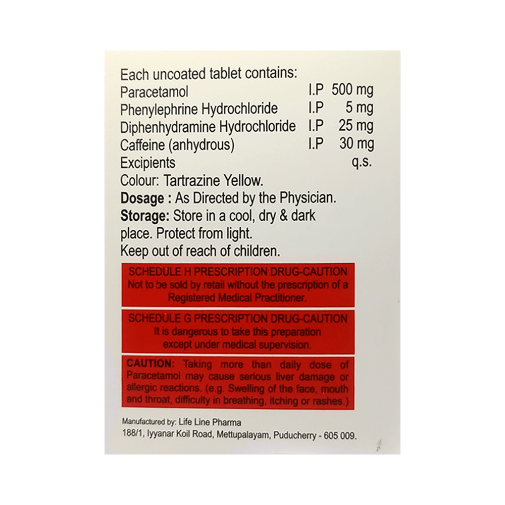 Salt Composition: Caffeine (30mg) + Diphenhydramine (25mg) + Paracetamol (500mg) + Phenylephrine (5mg)
