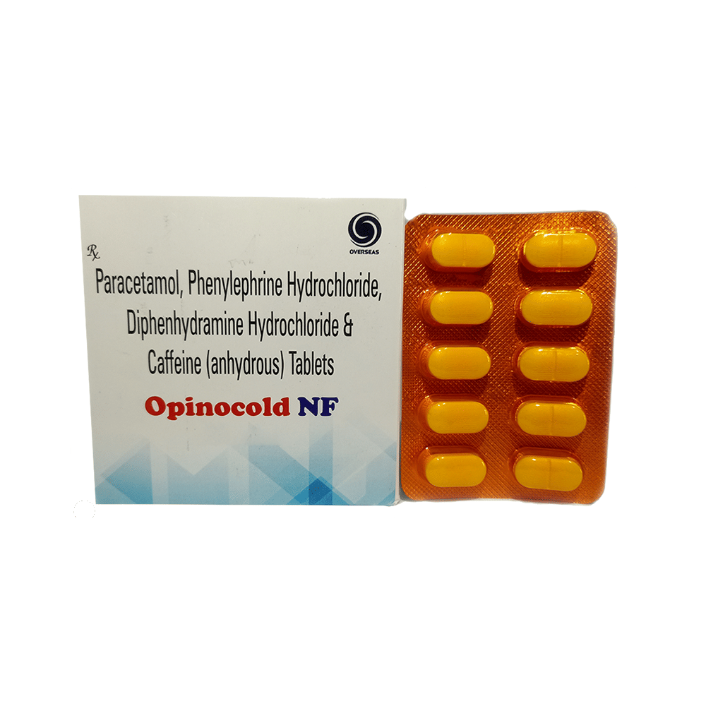 Opinocold NF Tablet is used to treat common cold symptoms. It provides temporary relief from stuffiness in the nose. It also helps relieve allergy symptoms like a runny nose and watery eyes. Opinocold NF Tablet is taken with or without food in a dose and duration as advised by the doctor. It is better to take it with food to avoid stomach upset. The dose you are given will depend on your condition and how you respond to the medicine. You should keep taking this medicine for as long as your doctor recommends. If you stop treatment too early, your symptoms may come back, and your condition may worsen. Let your doctor know about all other medications you are taking, as some may affect or be affected by this medicine.The most common side effects are nausea, vomiting, stomach pain, insomnia, restlessness, impaired coordination, and headache. Most of these are temporary and usually resolve with time. Contact your doctor straight away if you are at all concerned about any of these side effects. It can also cause dizziness and sleepiness, so do not drive or do anything that requires mental focus until you know how this medicine affects you. Avoid drinking alcohol while taking this medicine, as it can make dizziness worse.Before taking it, you should tell your doctor if you have any kidney or liver diseases so that your doctor can prescribe a suitable dose for you. Also, tell your doctor if you are pregnant, planning pregnancy, or breastfeeding.
