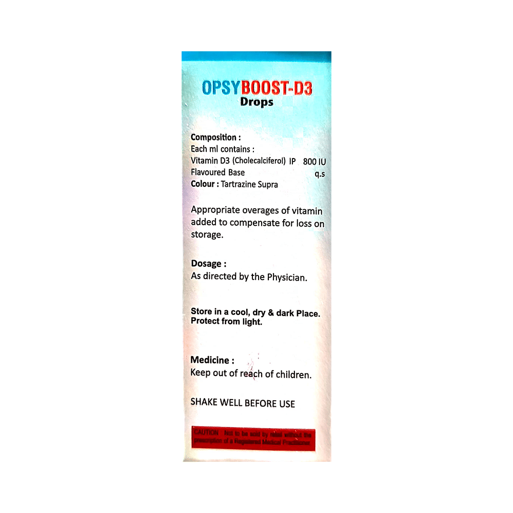 Opsyboost-D3 Oral Drops Strawberry is used in the treatment of vitamin D deficiency and osteoporosis. It helps the body to absorb calcium. Calcium is essential for maintaining strong and healthy bones. It is used when your diet does not provide enough calcium. Opsyboost-D3 Oral Drops Strawberry should be taken as directed by your doctor. It is best taken with or after food, as this helps your body absorb it, and you should take it regularly to get the most benefits. If you are using it to treat osteoporosis, you will also be prescribed other medicines. This medicine may be only part of a complete treatment program that includes making changes to your diet and taking calcium and vitamin supplements. Learn about the foods you should eat to ensure you get enough calcium and vitamin D.Opsyboost-D3 Oral Drops Strawberry has few side effects, and none are common. If you take too much, you may feel weakness, muscle pain, or a metallic taste in your mouth. If you experience any such side effects, speak with your doctor. They may be able to help you reduce or treat the symptoms.Before taking this medicine, tell your doctor if you have high calcium levels in your blood or if you have any heart, kidney, or liver disease. Some other medicines can decrease the absorption of vitamin D3, so let your doctor know about all the other medicines you are taking to make sure you are safe. This medicine may help during pregnancy when your body needs more vitamin D, but too much could harm your baby. Discuss it with your doctor.