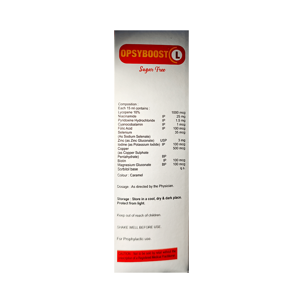 Opsyboost L Syrup Sugar Free is a combination of vitamins and mineral supplements. Biotin treats and prevents vitamin B7 deficiency. It is required for cell growth, production of fatty acids, and metabolism of fats and amino acids. The body also needs biotin to produce a protein called keratin that can improve the hair, skin, and nails. Several enzymes involved in crucial bodily processes require appropriate availability of copper. It works with iron to produce red blood cells and helps keep the nerves, blood vessels, bones, and immune system healthy. Cyanocobalamin is a form of vitamin B12 that helps treat certain anemias and nerve problems. Folic acid is essential for the production of red blood cells. It also prevents and treats folate deficiency and anemia. Iodine is required by the thyroid gland to make thyroid hormones. Lycopene is a strong antioxidant that protects the body from damaging molecules called free radicals and helps boost the immune system. Magnesium is essential for bone mineralization and the formation of the bone matrix. It also improves nervous and muscular functions. Niacinamide (vitamin B3) is needed for the functioning of fats and sugars to maintain healthy cells. Pyridoxine hydrochloride treats or prevents deficiency of vitamin B6 and improves the functioning of the nervous and immune systems. Selenium prevents cell damage and protects the body from the poisonous effects of heavy metals and other harmful substances. Zinc is needed for the body's immune system to work properly. It plays a role in growth, wound healing, and gut health maintenance and is also needed for the senses of taste and smell.
