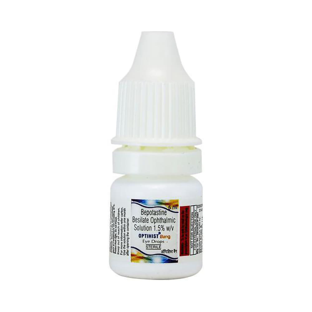 Optihist Bang 1.5% Eye Drop belongs to a group of medicines called antihistamines. It is used in the treatment of itching associated with inflammation in the eyes (redness and swelling) caused due to allergy. Follow your doctor’s instructions precisely for administering Optihist Bang 1.5% Eye Drop in the eye. It should be used regularly at evenly spaced time intervals as prescribed by your doctor. Do not skip any doses and finish the full course of treatment even if you feel better. Stopping the medicine too early may lead to returning or worsening.Commonly seen side effects seen with Optihist Bang 1.5% Eye Drop include eye irritation, headache, and nasopharyngitis. Consult your doctor if these side effects persist or if your condition worsens. It may cause blurring of your vision for a short time just after its use, so do not drive until your vision is clear.