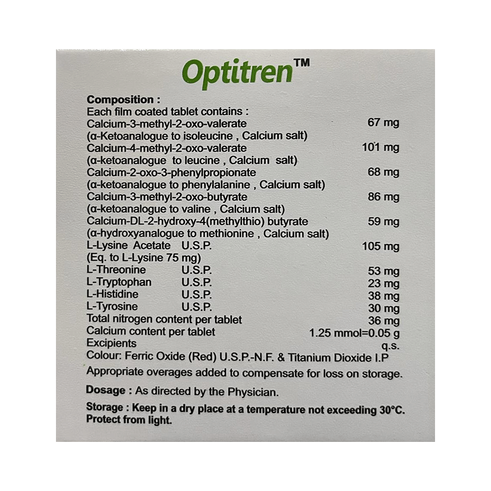 Optitren Tablet is a nutritional supplement used in the treatment of chronic kidney disease. It reduces urea levels in the blood and helps prevent the progression of kidney disease. This way it delays the risk of undergoing long-term dialysis. Optitren Tablet is to be taken by mouth with or without food. Take it in the exact dose and duration as advised by the doctor. Taking it along with a low-protein diet may help get the best of the medicine. Ensure that you maintain adequate calorie intake during treatment. While you are taking this medicine, your doctor may advise regular monitoring of serum calcium levels.There is limited data on the side effects of Optitren Tablet. Let your doctor know if you experience any symptoms while taking Optitren Tablet. They may be able to suggest ways to treat or manage the side effects.Before taking Optitren Tablet, it is important to tell your doctor if you are taking any other medicines for other health conditions. Avoid taking Optitren Tablet if you are allergic to its ingredients, or have high calcium levels (hypercalcemia). Regular monitoring of calcium levels is recommended during use.Avoid combining Optitren Tablet with calcium-containing supplements or certain antibiotics (e.g., tetracyclines, quinolones) without consulting a doctor, as they may interfere with absorption. Pregnant, breastfeeding women, and individuals with liver disease should seek a doctor’s advice before use. Avoid activities requiring full mental alertness, such as driving, until you know how the medication affects you.