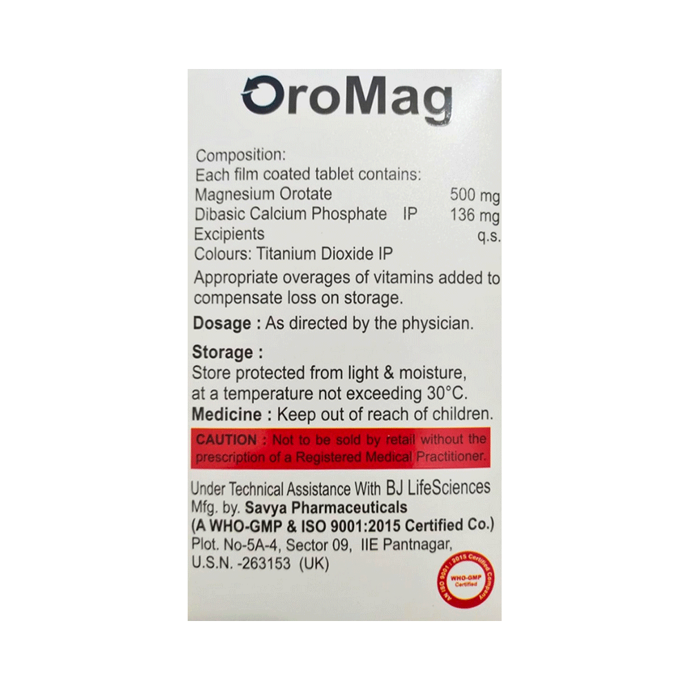 Oromag Tablet is a combination of dibasic calcium phosphate and magnesium orotate. Dibasic calcium phosphate prevents or treats low blood calcium levels by acting as a source of calcium. Magnesium orotate is an organic mineral salt composed of two synergic protective components: orotic acid (OA) and magnesium. It works as a mineral supplement to treat magnesium deficiency. Orotic acid transports magnesium into the cells. By providing calcium and magnesium, Oromag Tablet improves musculoskeletal, cardiovascular, and neurological function in individuals with low magnesium and calcium levels.
