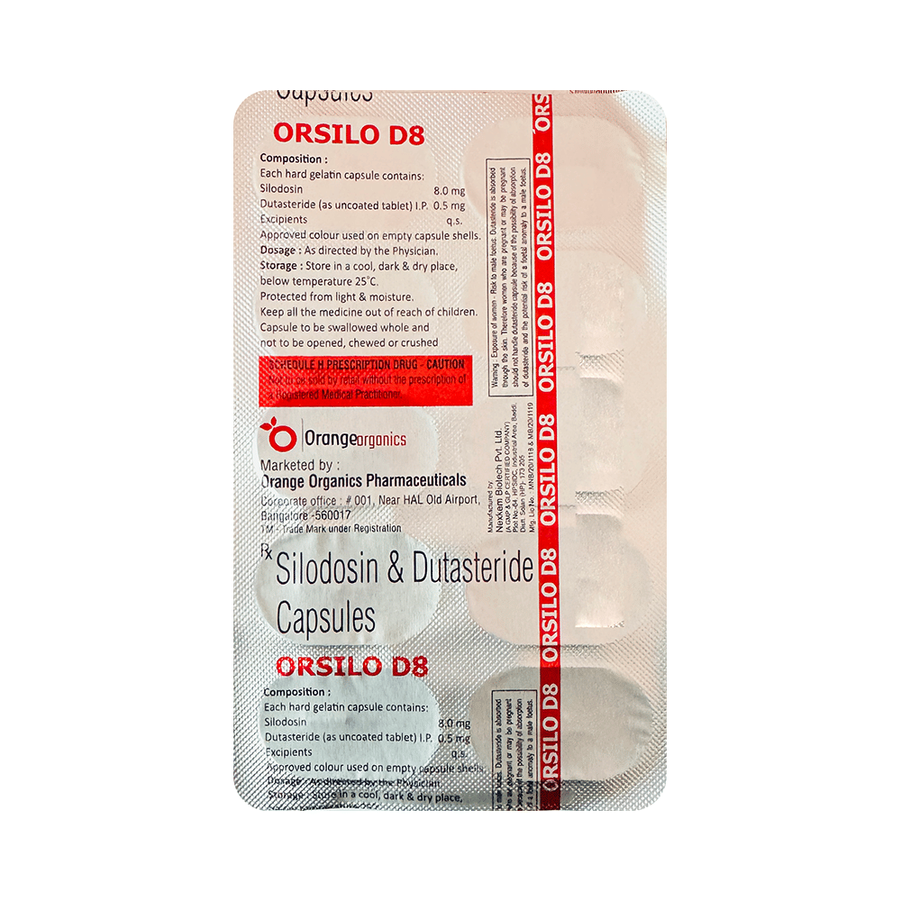 In Treatment of Benign prostatic hyperplasiaWhen your prostate gland becomes enlarged it can cause urinary problems such as difficulty passing urine and a need to go to the toilet frequently or urgently. It can also cause urine flow to be slower. If not treated, there is a risk that your urine flow will be completely blocked. Orsilo D 8 Capsule is a combination of two medicines that reduces the size of your prostate by blocking the production of a hormone which causes it to grow. Additionally, it relaxes the muscles in the bladder and prostate. Together they can rapidly relieve the symptoms and make it easier for you to urinate. However, it may take up to 6 months to notice the full benefits. Take this medicine exactly as prescribed for maximum benefits.