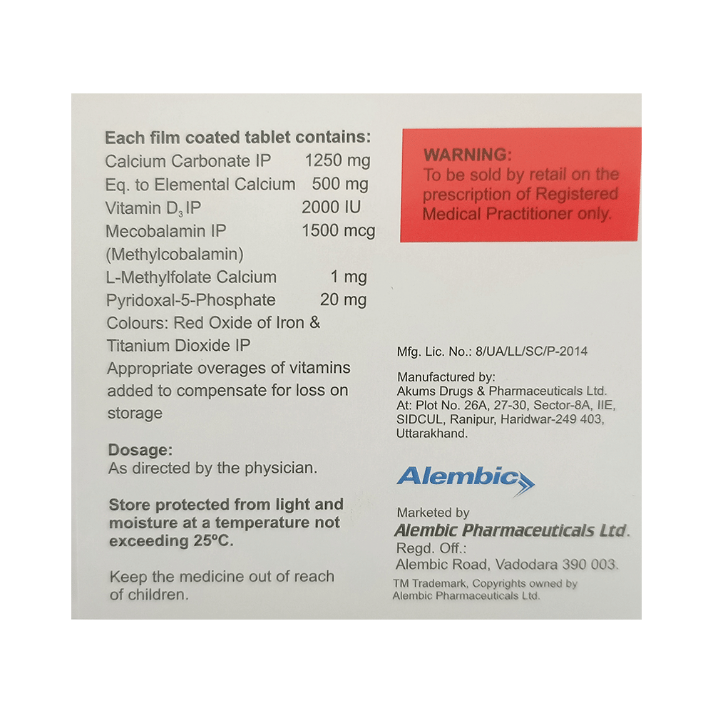 Salt Composition: Calcium Carbonate (1250mg) + Vitamin D3 (2000IU) + Methylcobalamin (1500mcg) + L-Methyl Folate Calcium (1mg) + Pyridoxal-5-phosphate (20mg)