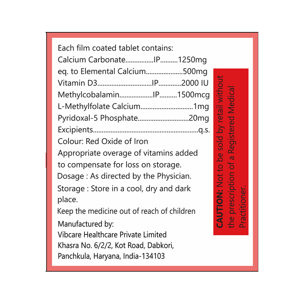 Salt Composition: Calcium Carbonate (1250mg) + Vitamin D3 (2000IU) + Methylcobalamin (1500mcg) + L-Methyl Folate Calcium (1mg) + Pyridoxal-5-phosphate (20mg)