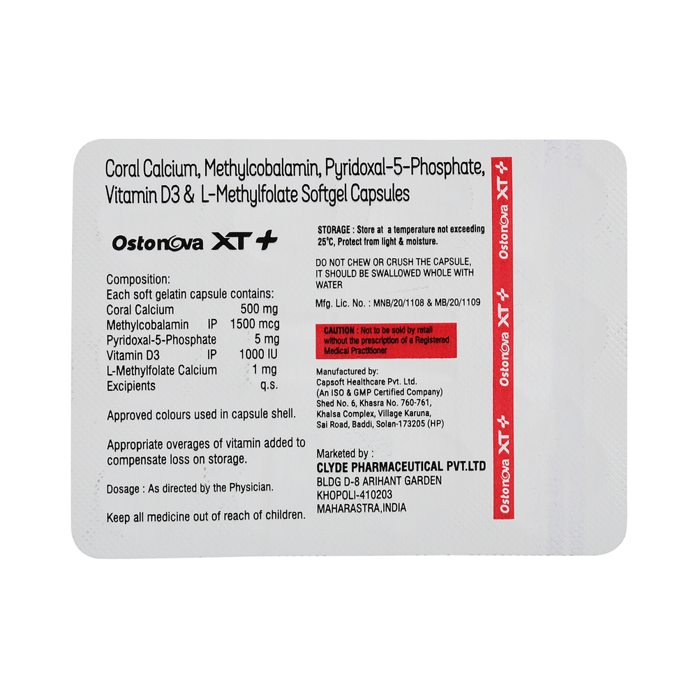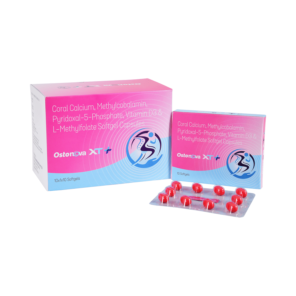Ostonova XT + Softgel Capsule is a combination of certain vitamins and minerals. Calcium citrate malate is a form of calcium that is easily absorbed by the body. It provides a source of bioavailable calcium, which is readily utilized by the bones and other tissues. L-Methyl folate calcium is the active form of folic acid that is necessary for the DNA synthesis, cell division, and production of red blood cells. It also supports various physiological processes, including those related to bone health. Methylcobalamin is a form of vitamin B12 that is essential for nerve health, DNA synthesis, and red blood cell production. Vitamin B12 also plays an indirect role in bone health by supporting the proper functioning of the nervous system, which is involved in bone regulation. Pyridoxal-5-phosphate is the active form of vitamin B6. It is involved in many enzymatic reactions in the body and is necessary for protein metabolism. Vitamin D3 helps the body absorb calcium from the intestines and regulate calcium levels in the blood.