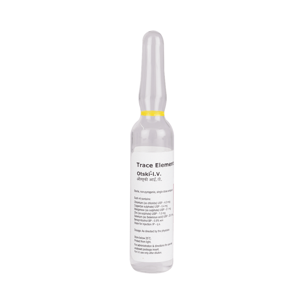In Treatment of Nutritional deficienciesOtski Injection is a nutritional supplement containing essential micronutrients required for growth and development. It helps your body break down fats, carbohydrates, and proteins to release energy. This medicine is essential for the management of blood sugar and cholesterol level. It also helps in the formation of red blood cells, builds strong immunity and in the normal functioning of nerve cells. Zinc helps in the crystallization and release of insulin in diabetic patients and can be co-prescribed with oral anti-diabetic agents and insulins when there is evidence of zinc deficiency. Taking it helps in maintaining the function of the vital organs of the body.