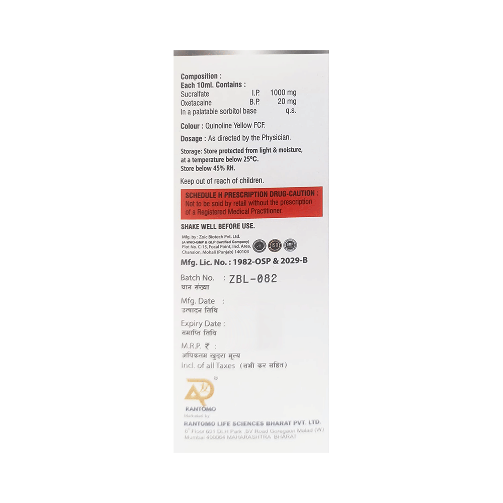 Salt Composition: Sucralfate (1000mg/10ml) + Oxetacaine (20mg/10ml)