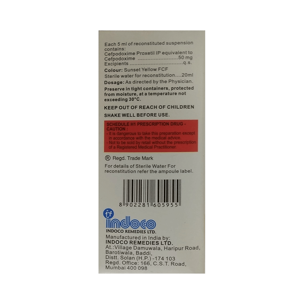 Oxipod 50mg Dry Syrup is an antibiotic medicine. It is commonly given to children for the treatment of a wide range of bacterial infections targeting the ears, eyes, nose, throat, lungs, skin, gastrointestinal tract, and urinary tract. It is also effective in treating typhoid fever in children and adolescents. Give this medicine to your child an hour before or two hours after meals. If your child develops a stomach upset, prefer giving it with food. Make sure to stick to the prescribed dose because it is given keeping in mind the type of infection, its severity, and the age and bodyweight of your child. In case your child gags and expels the medicine within 30 mins of intake, repeat the same dose but do not double dose if it's the time for the next dose.Do not give this medicine to your child in case of cold and flu symptoms as this medicine is an antibiotic and doesn’t work on infections caused by viruses. Doctors prescribe this medicine for cough and cold only when they detect any underlying secondary bacterial infection.Some of the minor and temporary side effects of this medicine include vomiting, diarrhea, nausea, rash, and headache. Usually, these episodes subside once your child’s body adapts to the medicine. However, if these effects persist or become bothersome for your child, call the doctor right away.Narrate your child’s complete medical history to your child’s doctor, including any previous episodes of allergy, heart problem, blood disorder, birth defects, airway obstruction, lung anomaly, gastrointestinal problem, skin disorder, liver impairment, and kidney malfunction. This information is critical for dose alterations and for planning your child’s overall treatment.
