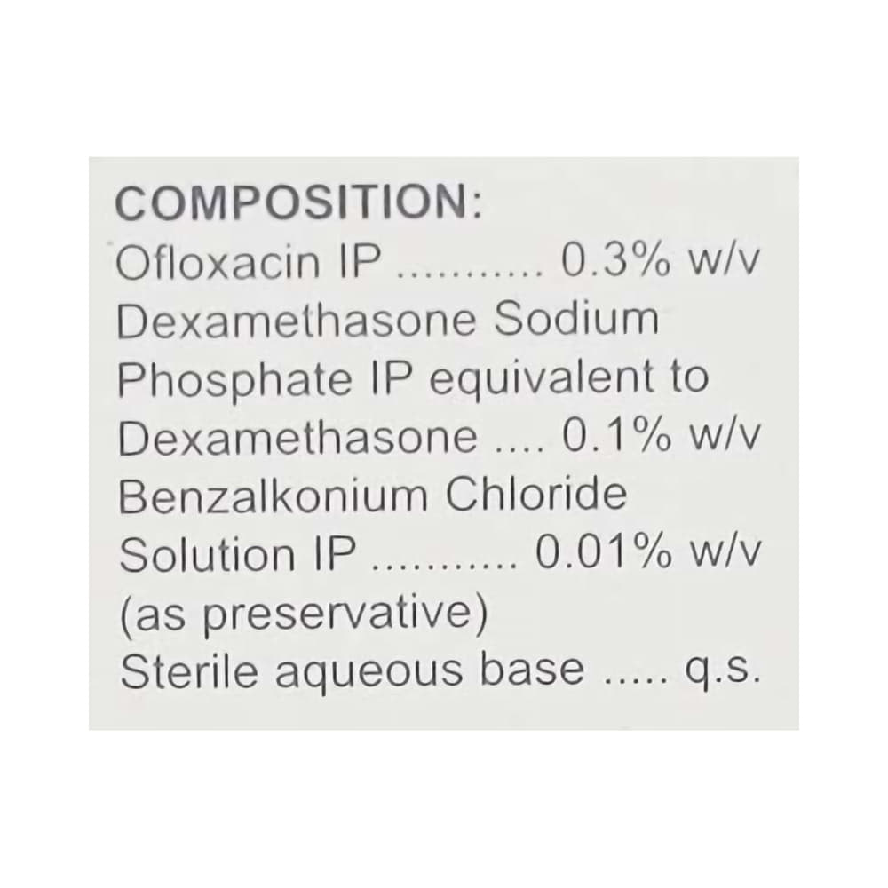 Salt Composition: Ofloxacin (0.3% w/v) + Dexamethasone (0.1% w/v)