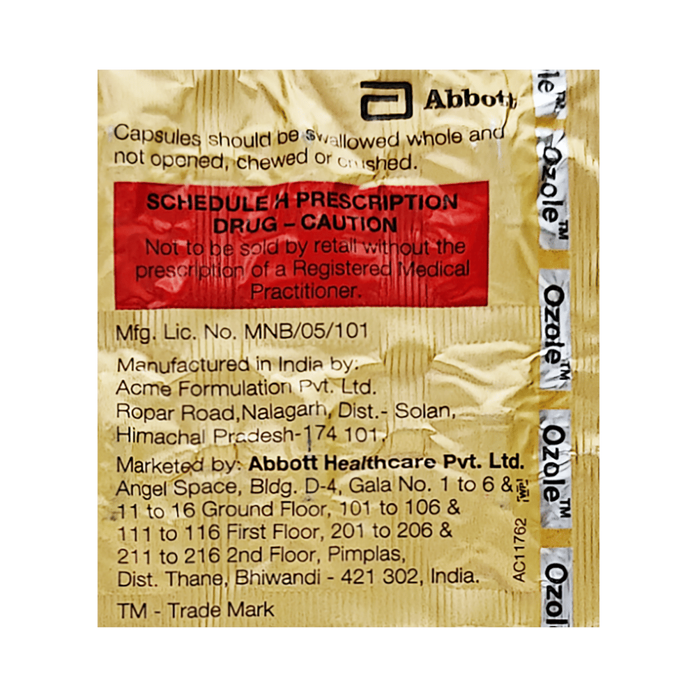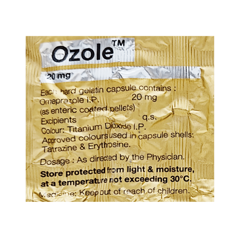 Ozole 20mg Capsule is a medicine that reduces the amount of acid produced in your stomach. It is used in the treatment of acid-related diseases of the stomach and intestine such as heartburn, acid reflux, peptic ulcer disease, and Zollinger-Ellison syndrome. It provides relief from symptoms and promotes healing. Ozole 20mg Capsule is best taken one hour before a meal, preferably in the morning. The dose will depend on your underlying condition and how you respond to the medicine. You should keep on taking it as prescribed even if your symptoms disappear quickly. You can increase the efficiency of the treatment by eating smaller meals more often and avoiding caffeinated drinks (like tea and coffee), and spicy or fatty foods.The most common side effects observed with this medicine include nausea, vomiting, headache, flatulence, diarrhea, and stomach pain. These symptoms are generally mild but if they bother you or do not go away, consult your doctor. Long-term use of this medicine may lead to an increased risk of side effects. For instance, using this medicine for more than 1 year may increase your risk for bone fractures, especially with higher doses. Talk to your doctor about ways to prevent bone loss (osteoporosis).Before taking this medicine, let your doctor know if you have or had severe liver problems, allergic reactions to similar medicines, or bone loss (osteoporosis). Other medicines may affect, or be affected by, this medicine. Let your doctor know about all other medicines you are taking, to make sure it is safe. This is particularly important if you are taking medicines for HIV, fungal infections, tuberculosis, epilepsy (fits), or some types of blood thinners. Pregnant or breastfeeding women should also consult their doctor before taking this medicine.