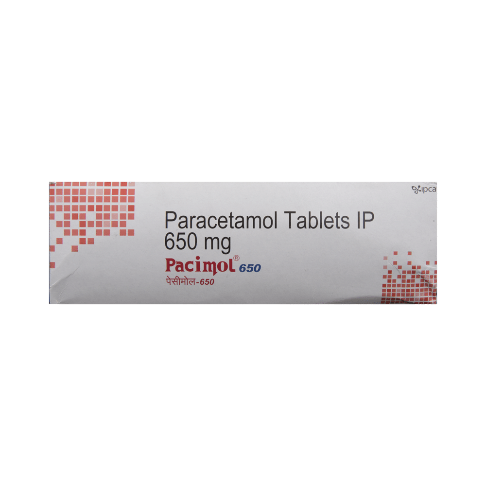 Pacimol 650 Tablet helps relieve pain and fever by blocking the release of certain chemical messengers responsible for fever and pain. It is used to treat headaches, migraine, toothaches, sore throats, period (menstrual) pains, arthritis, muscle aches, and the common cold. Pacimol 650 Tablet may be prescribed alone or in combination with another medicine. You should take it regularly as advised by your doctor. It is usually best taken with food otherwise it may upset your stomach. Do not take more or use it for longer than recommended.Side effects are rare if this medicine is used correctly but this medicine may cause stomach pain, nausea, and vomiting in some people. Consult your doctor if any of these side effects bother you or do not go away.This medicine is widely prescribed and considered safe but is not suitable for everybody. Before taking it, let your doctor know if you have liver or kidney problems or are using blood-thinning medicines. It may affect the dose or suitability of this medicine. Let your doctor know about all the other medicines you are taking because they may affect, or be affected by, this medicine.