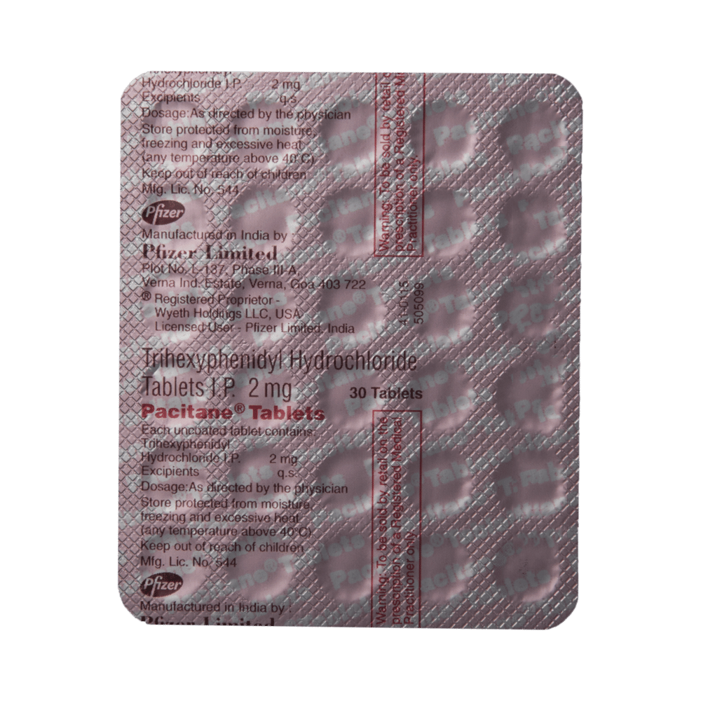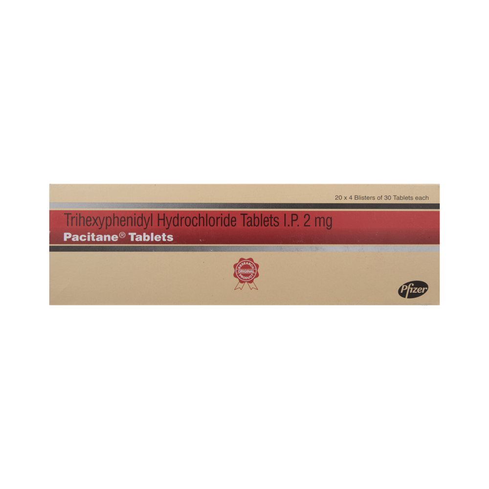 Pacitane Tablet is used with other medicines to treat Parkinson’s disease. It’s also used to treat severe movement side effects caused by certain drugs (drug-induced movement disorder). Pacitane Tablet can be taken with food or without food. Consider taking it with food if it causes an upset stomach. Take it at the same time each day; this helps maintain a consistent level of medicine in the body. Take this medicine in the dose and duration as advised by your doctor, and if you have missed a dose, take it as soon as you remember. Do not skip any doses and finish the full course of treatment even if you feel better. This medication must not be stopped suddenly without talking to the doctor, as it may result in a worsening of symptoms.Some common side effects of this medicine include nausea, vomiting, and blurred vision. It even causes dizziness and sleepiness, so do not drive or do anything that requires mental focus until you know how this medicine affects you. Dry mouth may occur commonly while using this medicine, so try to do frequent mouth rinses, maintain good oral hygiene, and increase water intake. Avoid wearing contact lenses, as Pacitane Tablet may cause dry eyes as well. It is important to inform your doctor if you suffer from glaucoma or have trouble passing urine.Before using Pacitane Tablet, you should tell your doctor if you've ever had heart problems, problems with passing urine, liver or kidney disease. It may also affect, or be affected by, some other drugs you are using, so let your doctor know what these are to be safe. Pregnant or breastfeeding mothers should consult their doctor before starting treatment with this medicine.