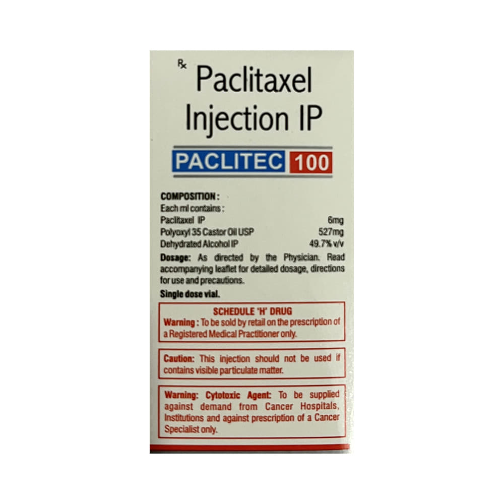 Paclitec 100 Injection is an anti-cancer medication used for the treatment of breast cancer, pancreatic cancer and non-small cell lung cancer. It is given as an injection by a qualified medical professional. Your doctor will decide what dose is necessary and how often you need to take it. This will depend on what you are being treated for and may change from time to time. You should take it exactly as your doctor has advised. Taking it in the wrong way or taking too much can cause very serious side effects. It may take several weeks or months for you to see or feel the benefits but do not stop taking it unless your doctor tells you to.Some common side effects of this medicine include nausea, vomiting, and weakness. It may also cause serious side effects such as swelling of hands, lips, hair loss, and weight gain. To reduce these side effects your doctor may suggest some medication along with it. But, inform your doctor if you notice unexplained bruising or bleeding, sore throat, mouth ulcers, high temperature (fever). This medicine may reduce the number of blood cells (decrease red blood and white blood cells) in your blood, thereby, increasing the susceptibility to infections. Regular blood tests are required to check your blood cells and liver function.Before taking it, tell your doctor if you have heart disease, liver, or kidney problems or are taking any medicines to treat infections. Many other medicines can affect, or be affected by, this medicine so let your doctor know all medications you are using. This medicine is not recommended during pregnancy or while breastfeeding. The use of effective contraception by both males and females during treatment is important to avoid pregnancy.